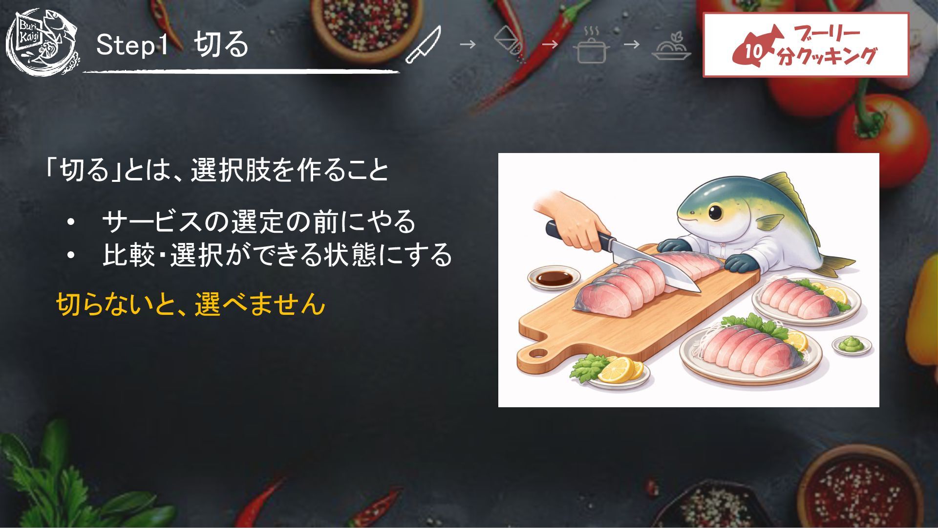 ブーリー 分クッキング 10 ブーリー 分クッキング 10 「切る」とは、選択肢を作ること 切らないと、選べません • サービスの選定の前にやる