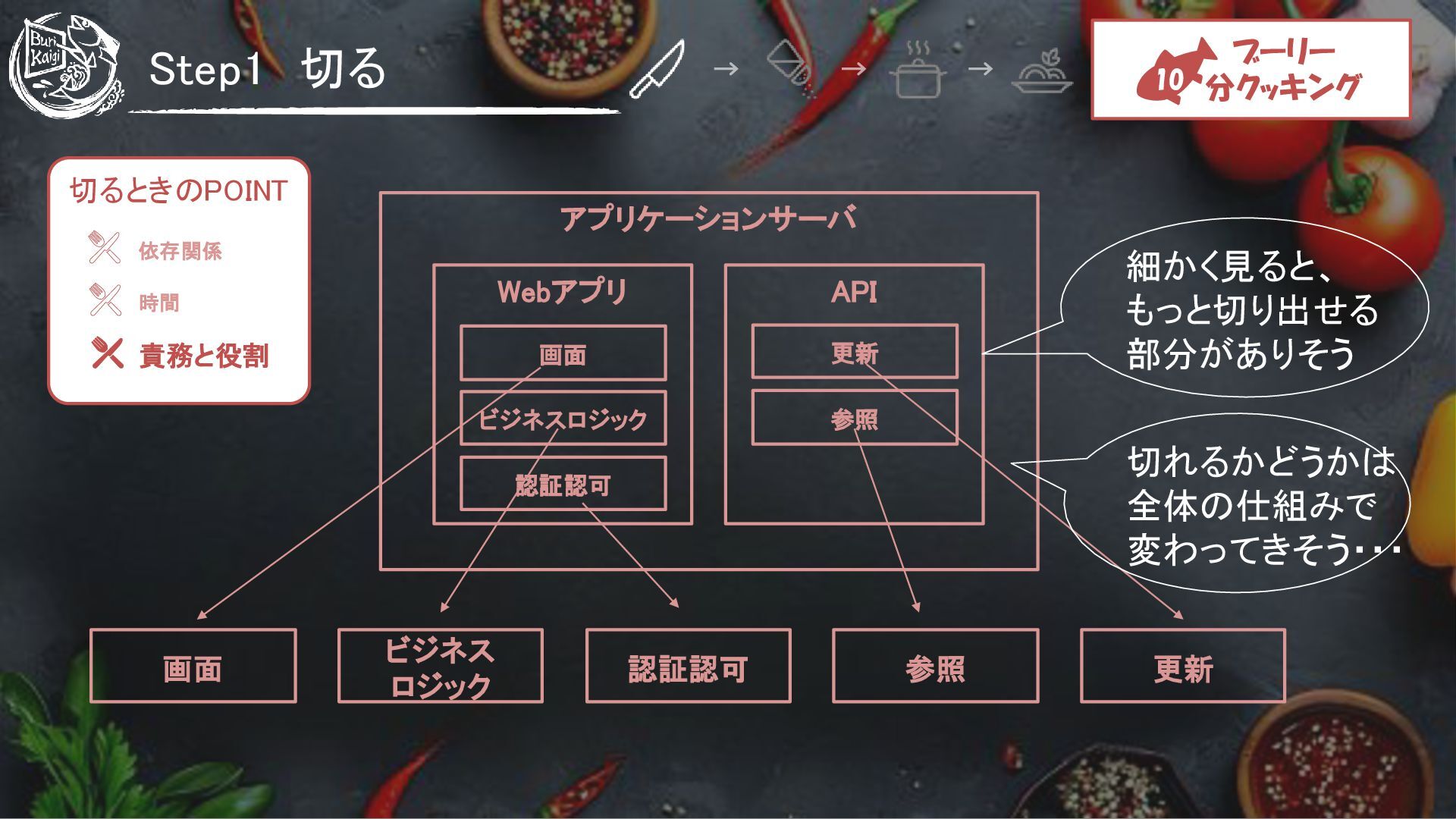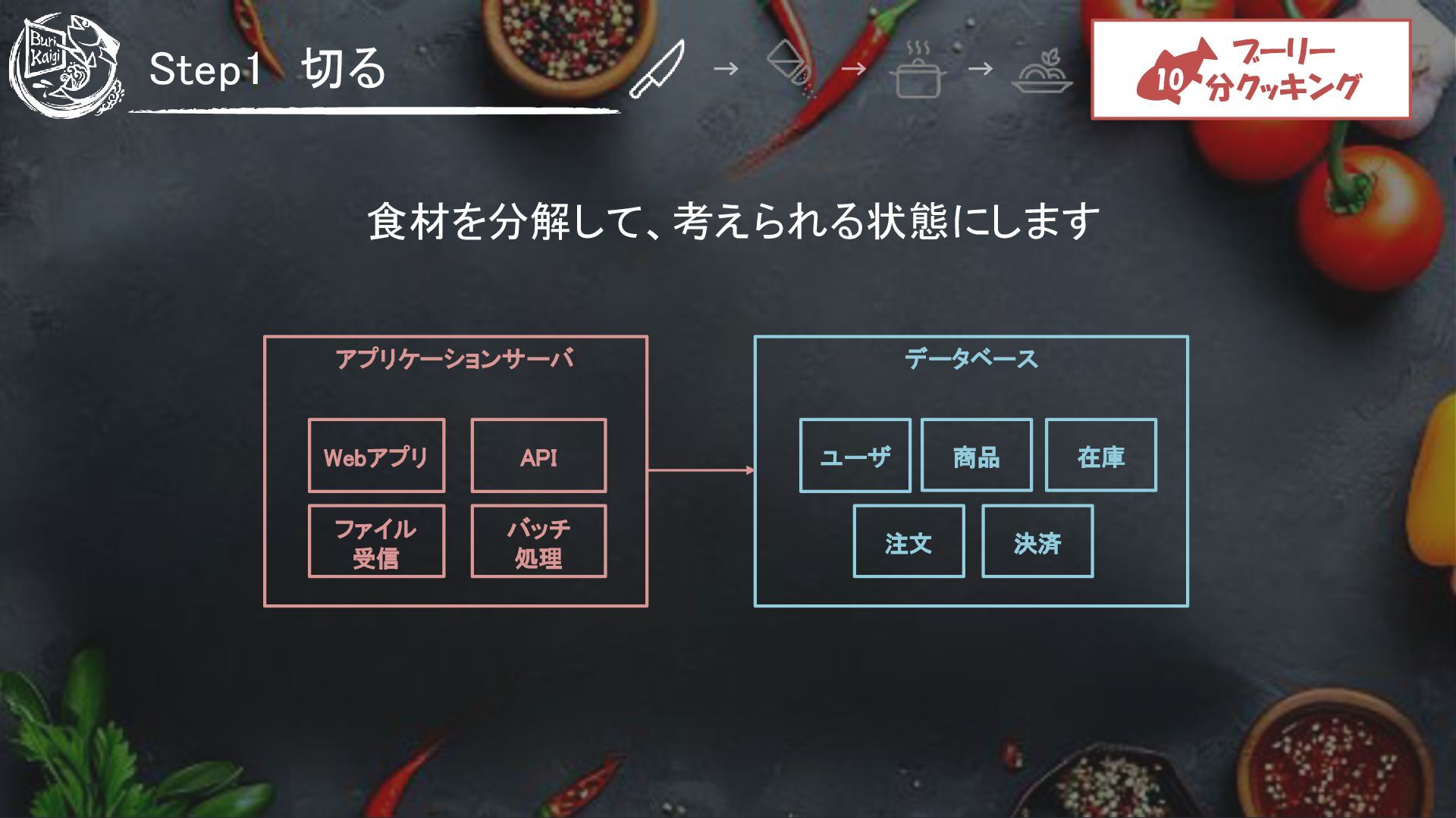 ブーリー 分クッキング 10 アプリケーションサーバ Webアプリ 画面 Step1 切る API ビジネスロジック