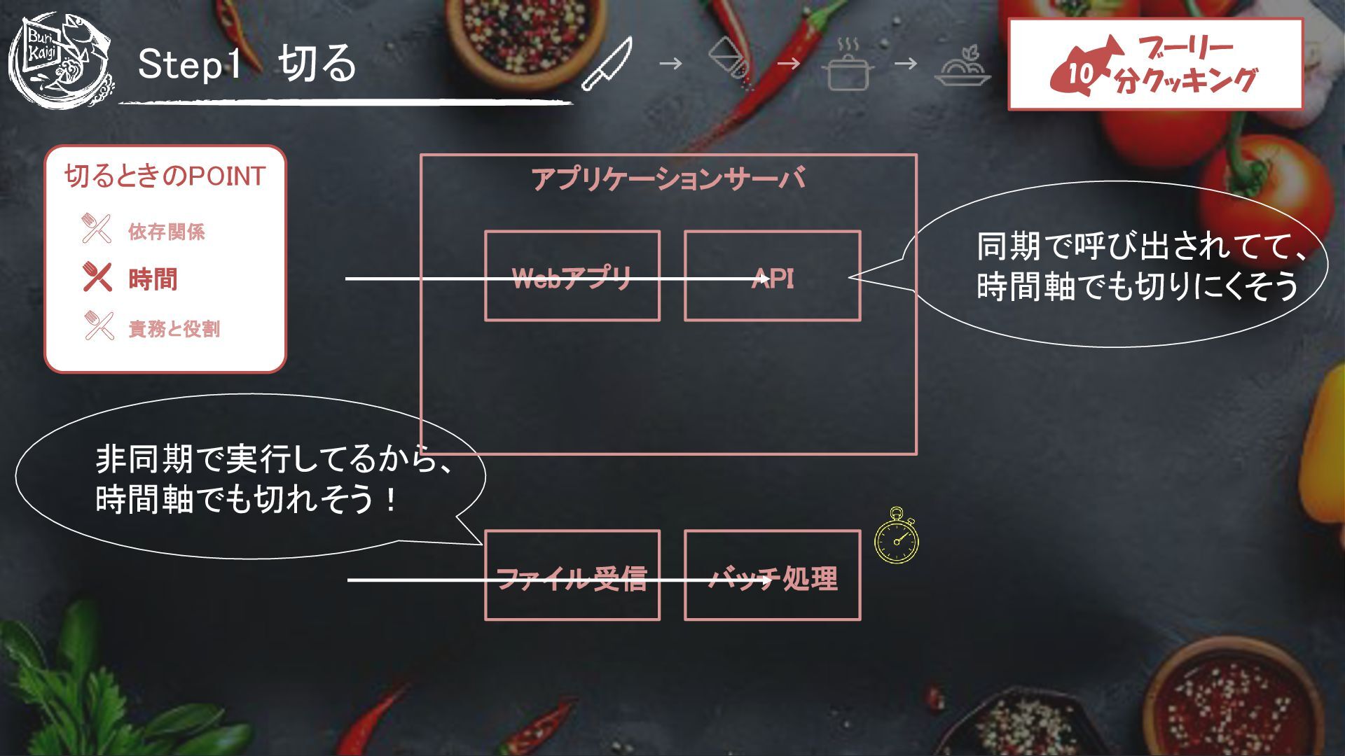 ブーリー 分クッキング 10 Step1 切る アプリケーションサーバ Webアプリ ファイル受信 API バッチ処理