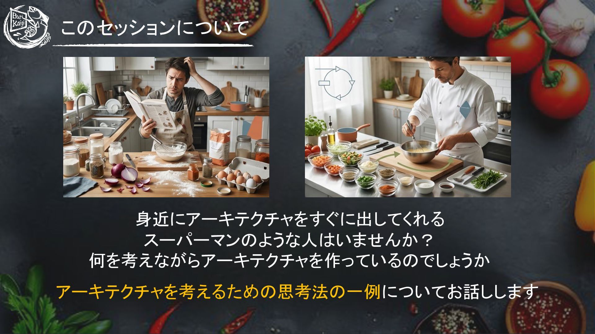 身近にアーキテクチャをすぐに出してくれる スーパーマンのような人はいませんか? 何を考えながらアーキテクチャを作っているのでしょうか このセッションについて アーキテクチャを考えるための思考法の一例についてお話しします
