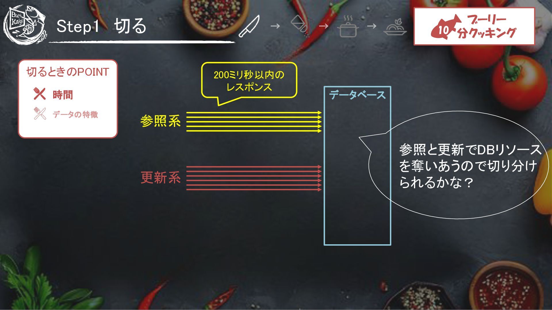 ブーリー 分クッキング 10 データベース 参照系 更新系 200ミリ秒以内の レスポンス Step1 切る