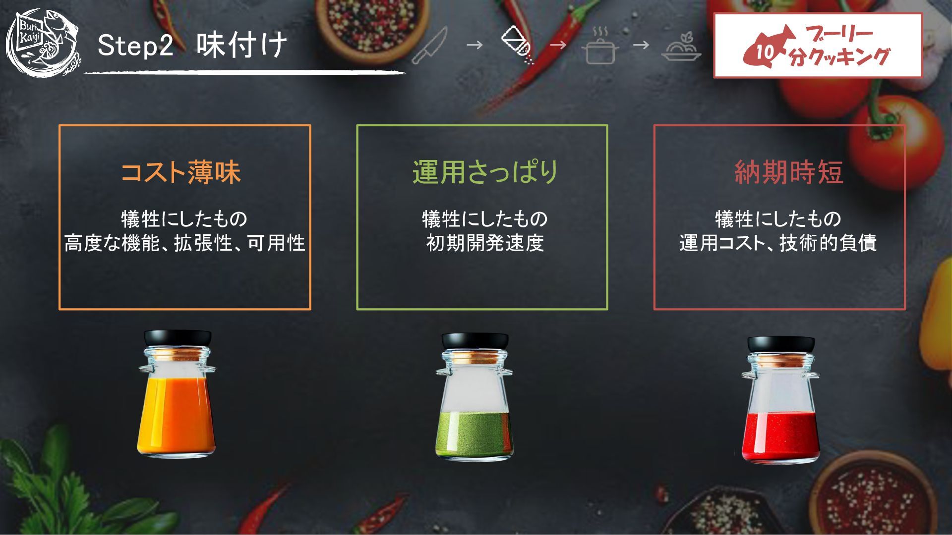 ブーリー 分クッキング 10 Step2 味付け コスト薄味 犠牲にしたもの 高度な機能、拡張性、可用性 運用さっぱり 犠牲にしたもの