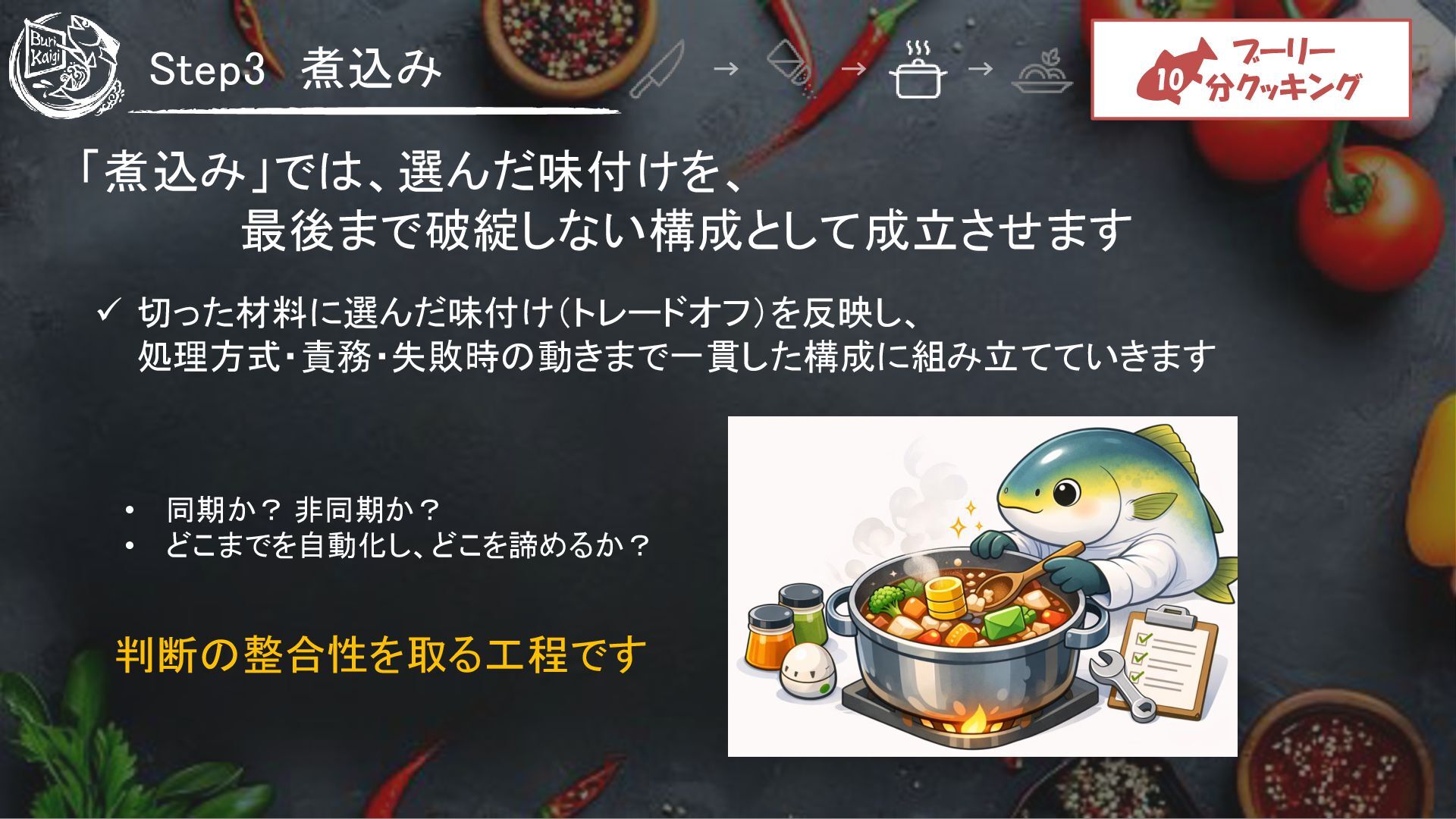 ブーリー 分クッキング 10 Step3 煮込み 「煮込み」では、選んだ味付けを、 最後まで破綻しない構成として成立させます ✓ 切った材料に選んだ味付け(トレードオフ)を反映し、 処理方式・責務・失敗時の動きまで一貫した構成に組み立てていきます