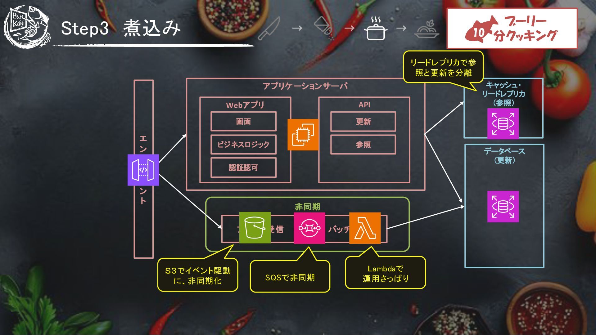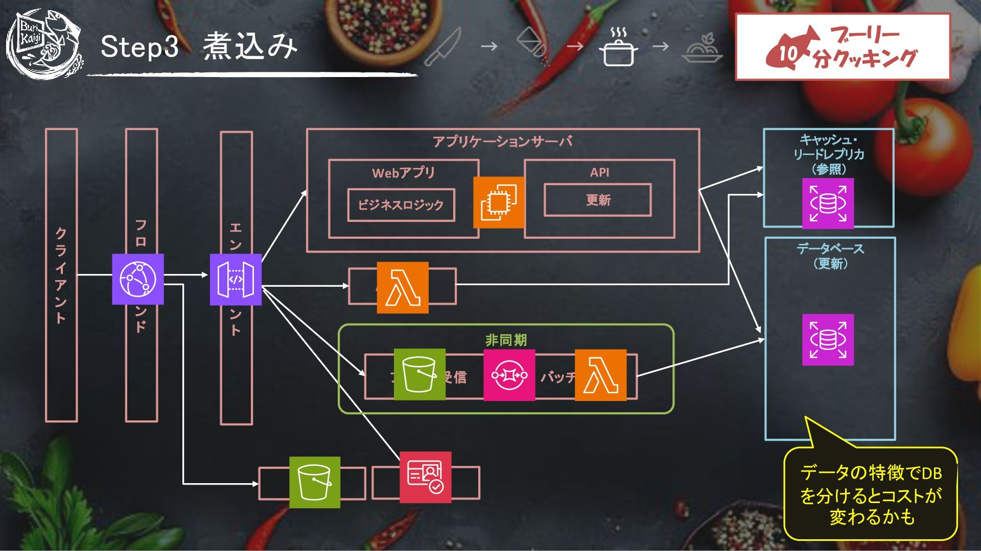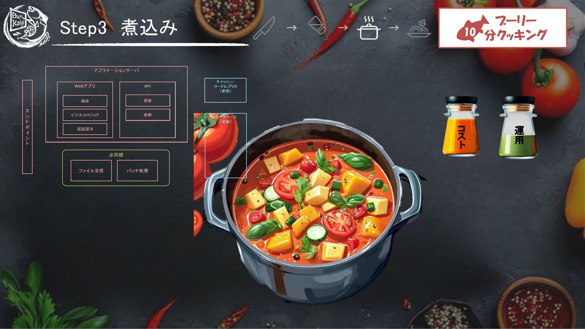 ブーリー 分クッキング 10 Step3 煮込み データベース (更新) アプリケーションサーバ Webアプリ API