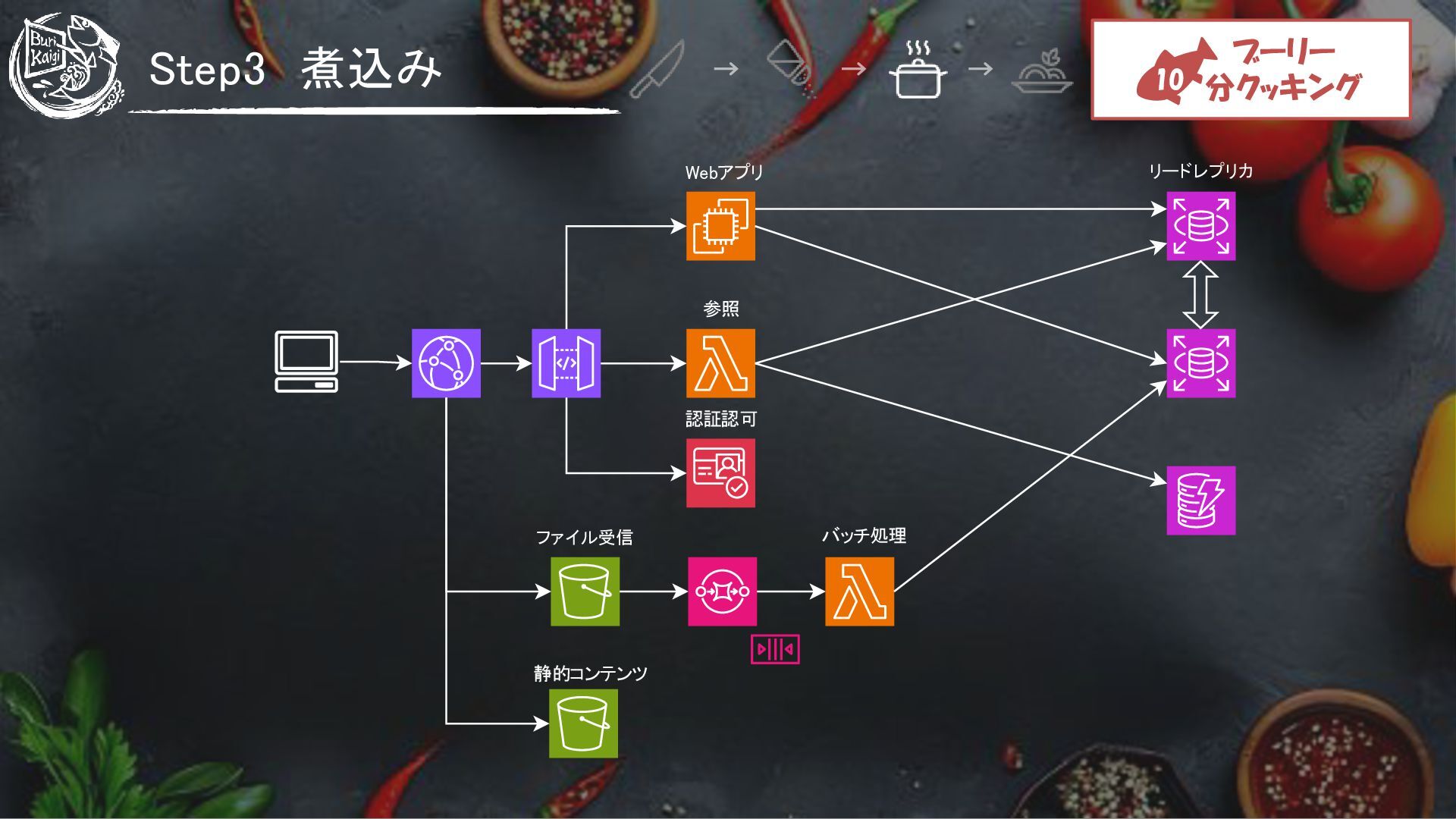 ブーリー 分クッキング 10 Step3 煮込み リードレプリカ 参照 ファイル受信 バッチ処理 認証認可