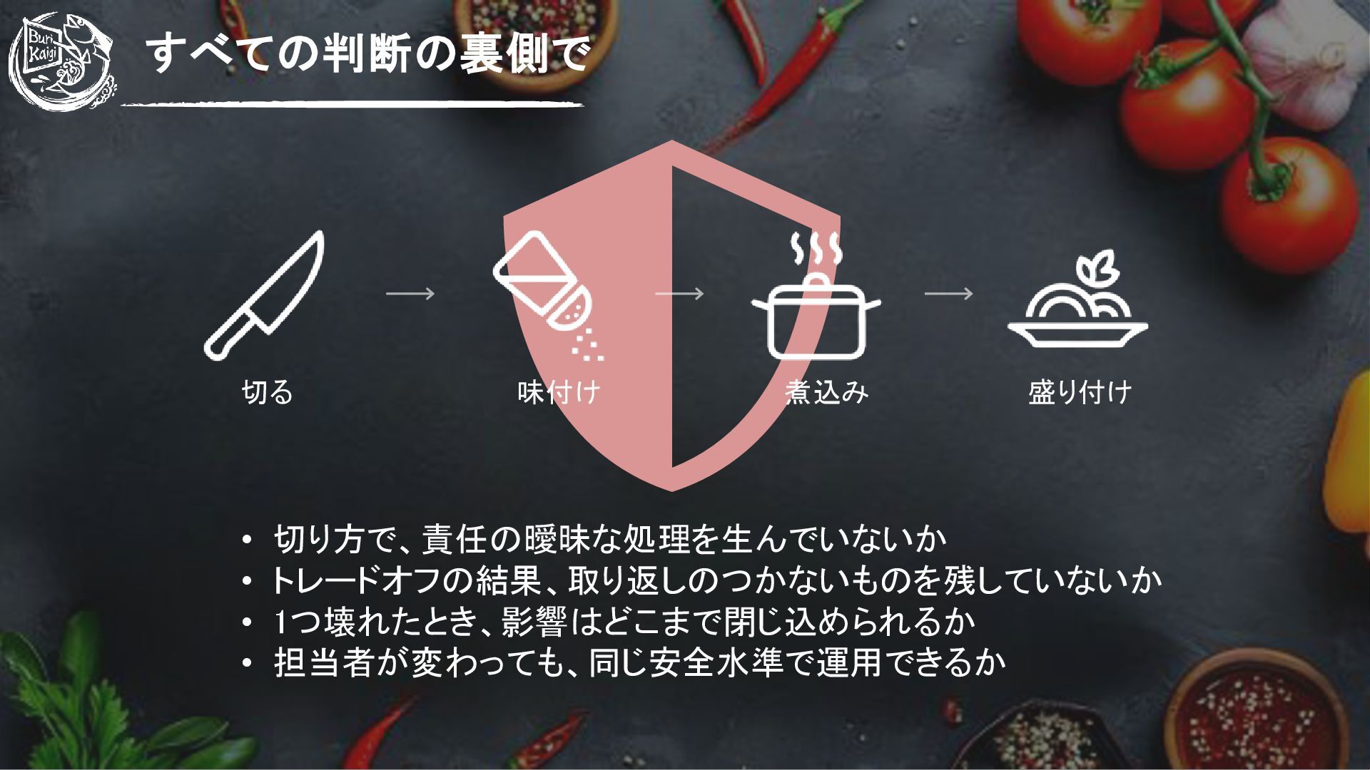 「盛り付け」は、料理のおいしさを 「維持し続ける」ための工程 運用 人が変わっても回るか 監視 異常に気づけるか 障害対応 止まっても復帰できるか バックアップ 取り返しがつくか