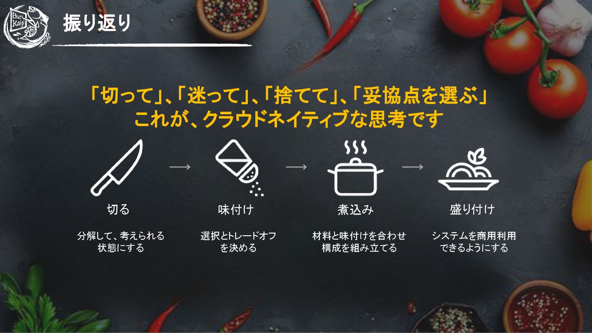 振り返り 「切って」、「迷って」、「捨てて」、「妥協点を選ぶ」 これが、クラウドネイティブな思考です 分解して、考えられる 状態にする 切る 味付け 煮込み 盛り付け 選択とトレードオフ