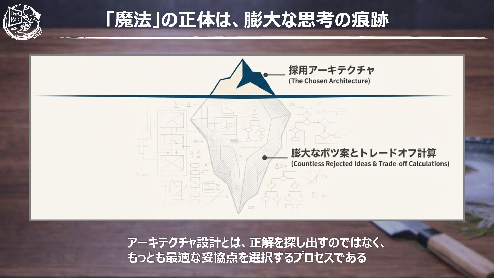 「魔法」の正体は、膨大な思考の痕跡 アーキテクチャ設計とは、正解を探し出すのではなく、 もっとも最適な妥協点を選択するプロセスである