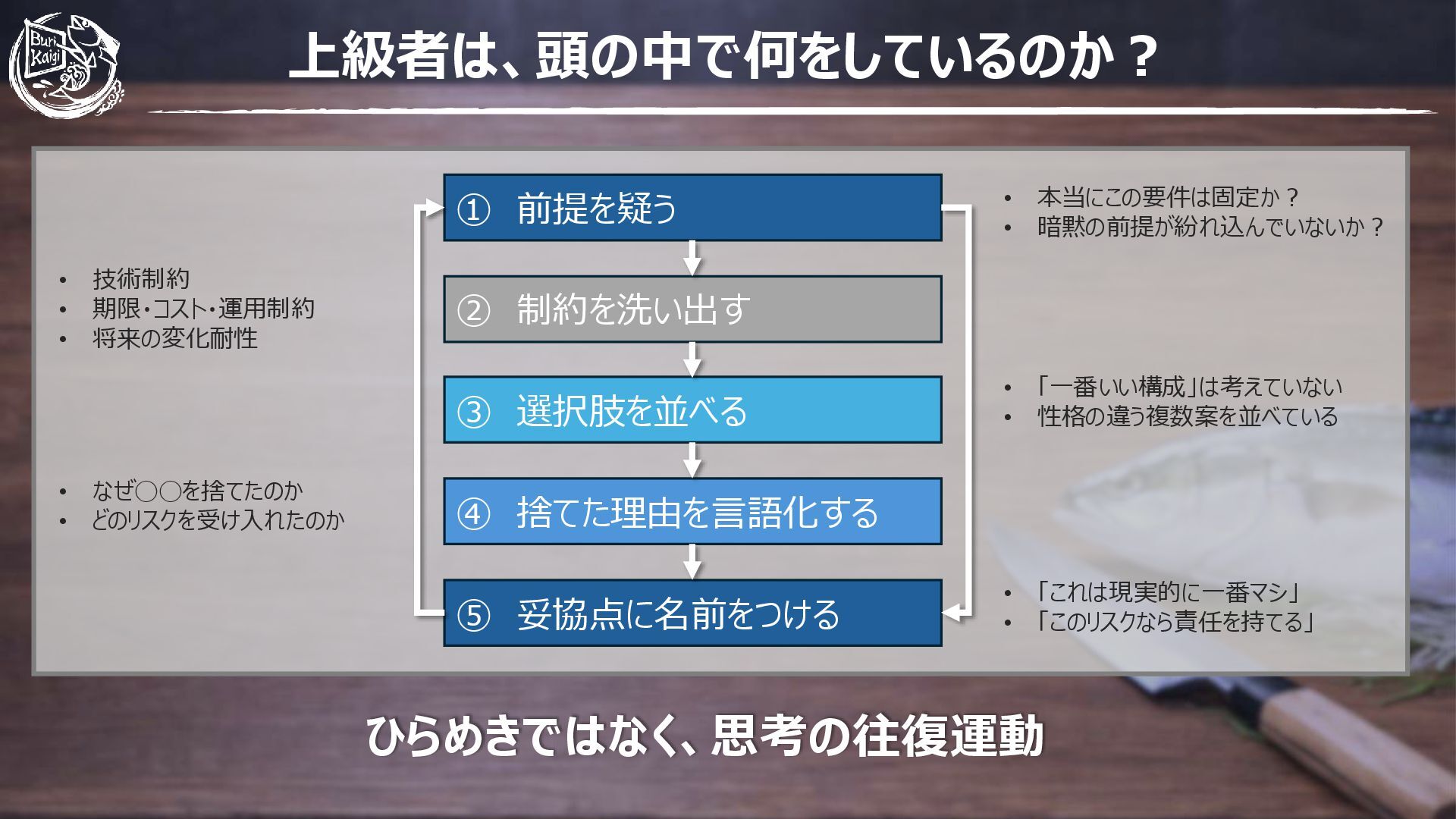 ⑤ 妥協点に名前をつける • 本当にこの要件は固定か? • 暗黙の前提が紛れ込んでいないか? • 「一番いい構成」は考えていない • 性格の違う複数案を並べている • なぜ◯◯を捨てたのか • どのリスクを受け入れたのか • 技術制約 • 期限・コスト・運用制約 • 将来の変化耐性 • 「これは現実的に一番マシ」 • 「このリスクなら責任を持てる」