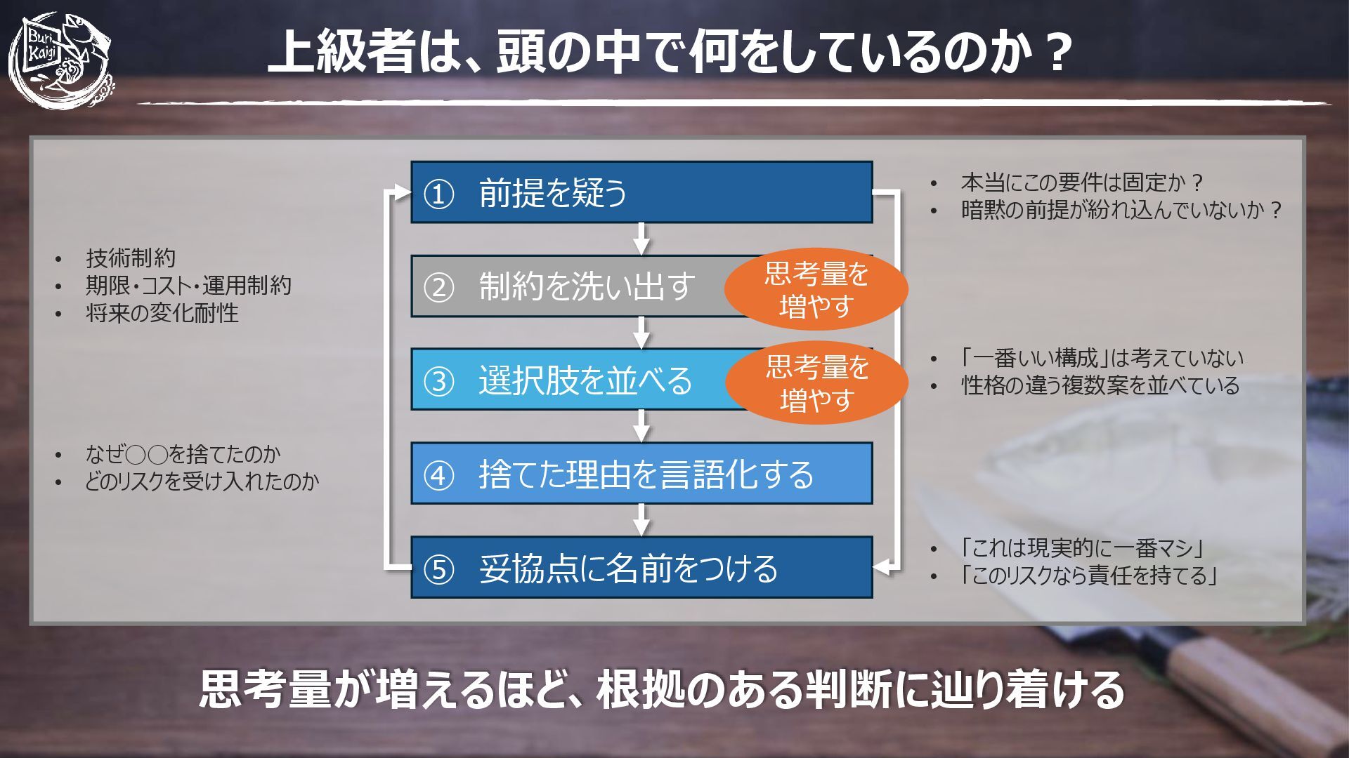 上級者は、頭の中で何をしているのか? 思考量が増えるほど、根拠のある判断に辿り着ける ① 前提を疑う ② 制約を洗い出す ③ 選択肢を並べる ④ 捨てた理由を言語化する