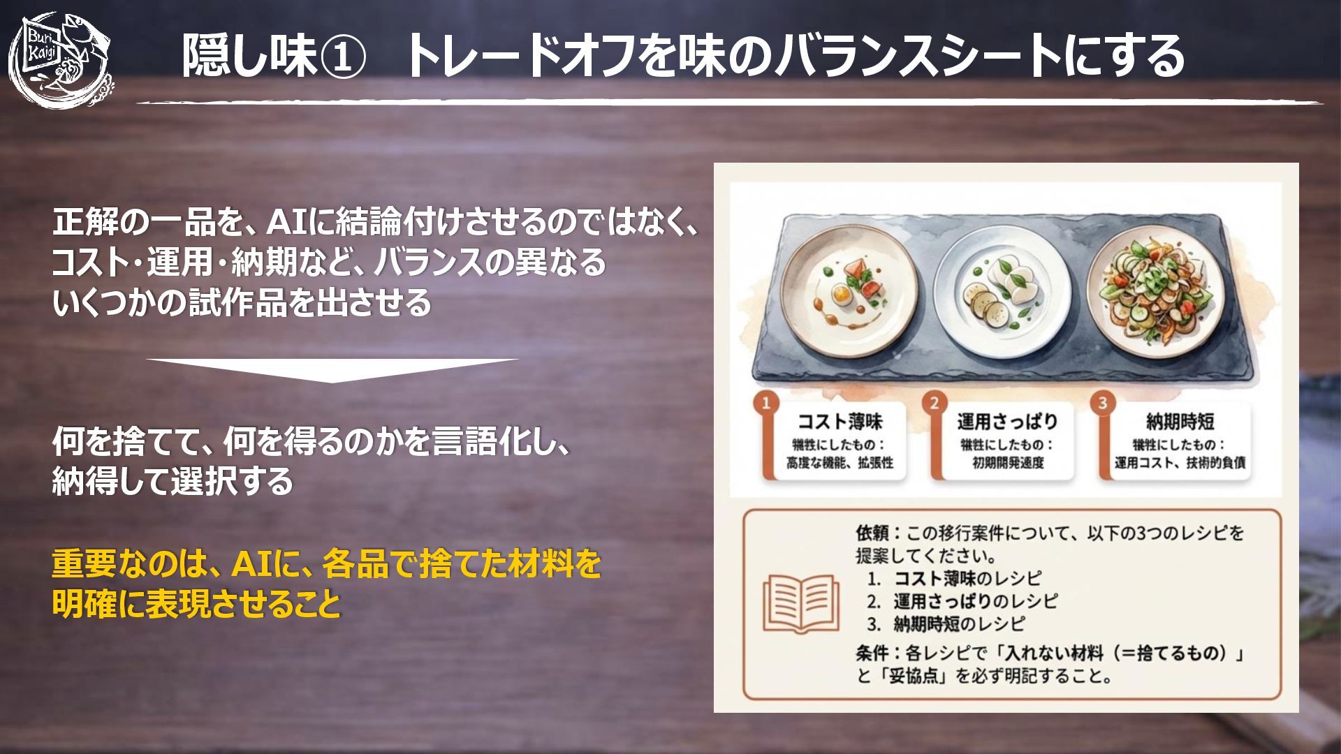 隠し味① トレードオフを味のバランスシートにする 正解の一品を、AIに結論付けさせるのではなく、 コスト・運用・納期など、バランスの異なる いくつかの試作品を出させる 何を捨てて、何を得るのかを言語化し、 納得して選択する 重要なのは、AIに、各品で捨てた材料を 明確に表現させること