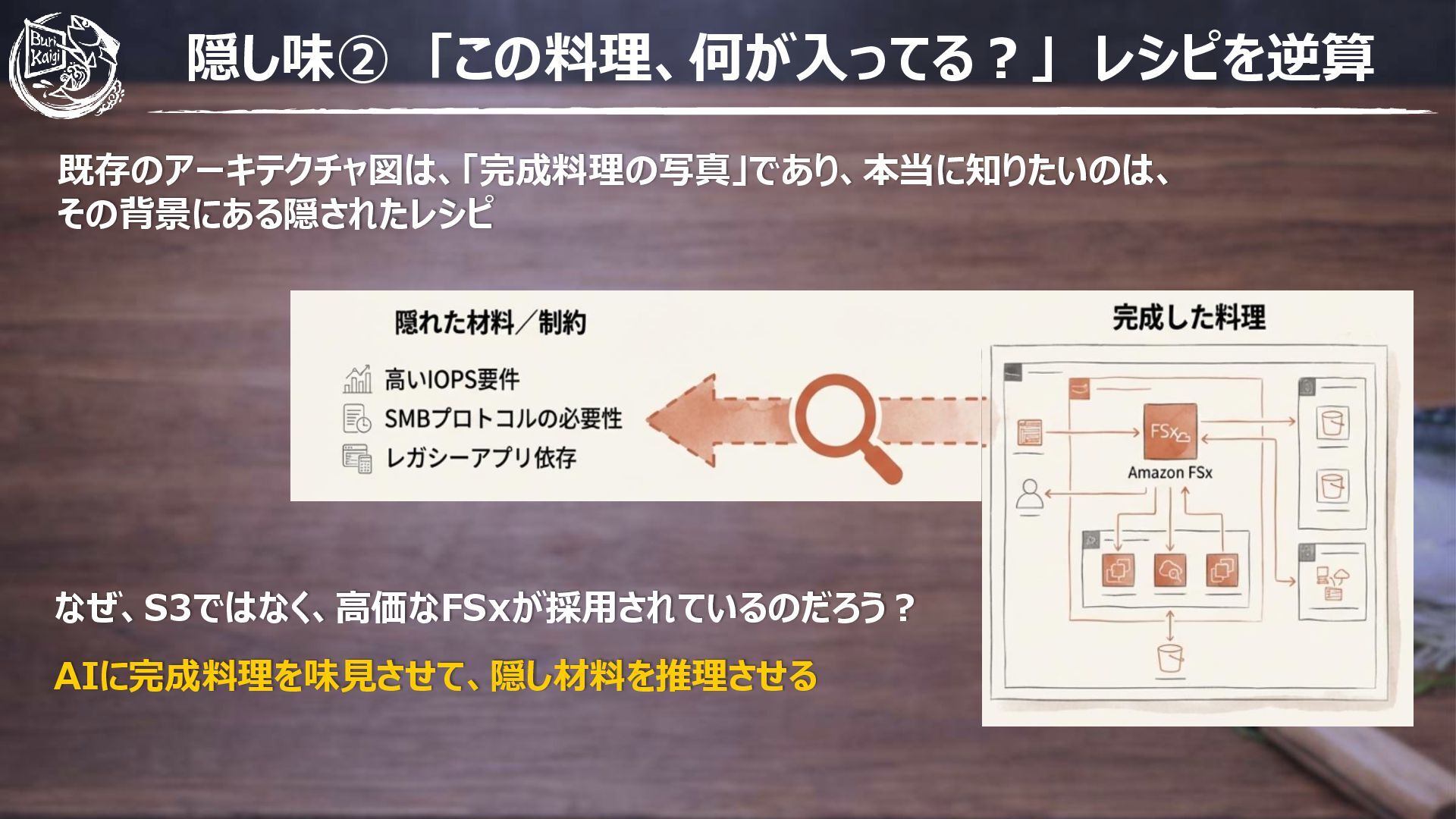 隠し味② 「この料理、何が入ってる?」 レシピを逆算 既存のアーキテクチャ図は、「完成料理の写真」であり、本当に知りたいのは、 その背景にある隠されたレシピ AIに完成料理を味見させて、隠し材料を推理させる なぜ、S3ではなく、高価なFSxが採用されているのだろう?