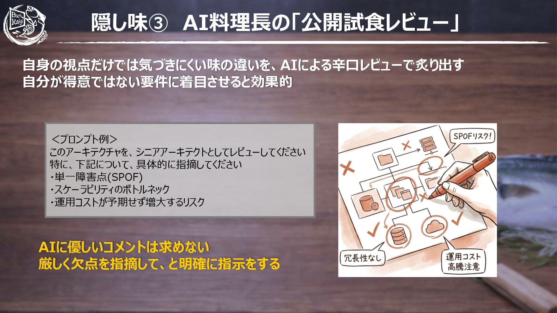 隠し味③ AI料理長の「公開試食レビュー」 自身の視点だけでは気づきにくい味の違いを、AIによる辛口レビューで炙り出す 自分が得意ではない要件に着目させると効果的 AIに優しいコメントは求めない 厳しく欠点を指摘して、と明確に指示をする <プロンプト例> このアーキテクチャを、シニアアーキテクトとしてレビューしてください 特に、下記について、具体的に指摘してください ・単一障害点(SPOF)