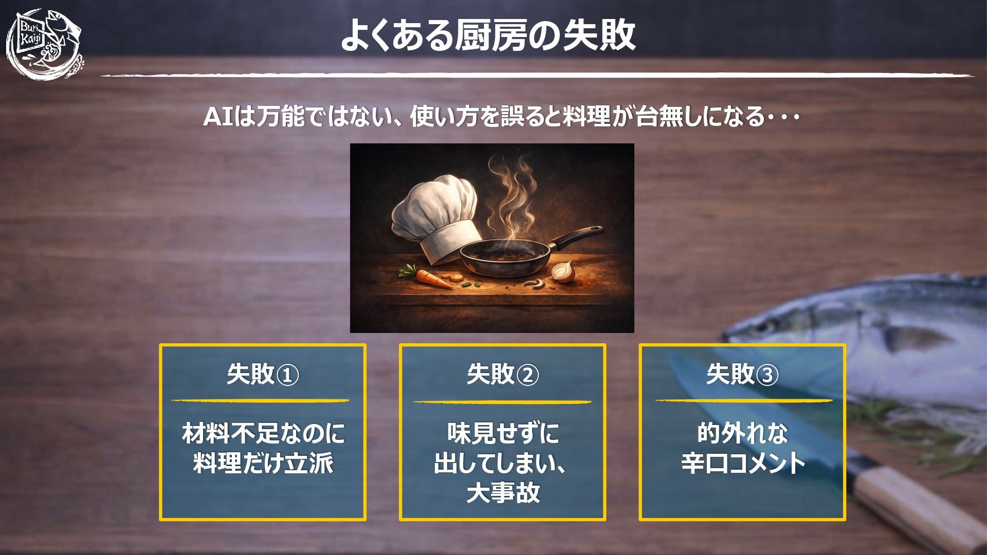 よくある厨房の失敗 AIは万能ではない、使い方を誤ると料理が台無しになる・・・ 失敗③ 的外れな 辛口コメント 失敗① 材料不足なのに 料理だけ立派 失敗② 味見せずに