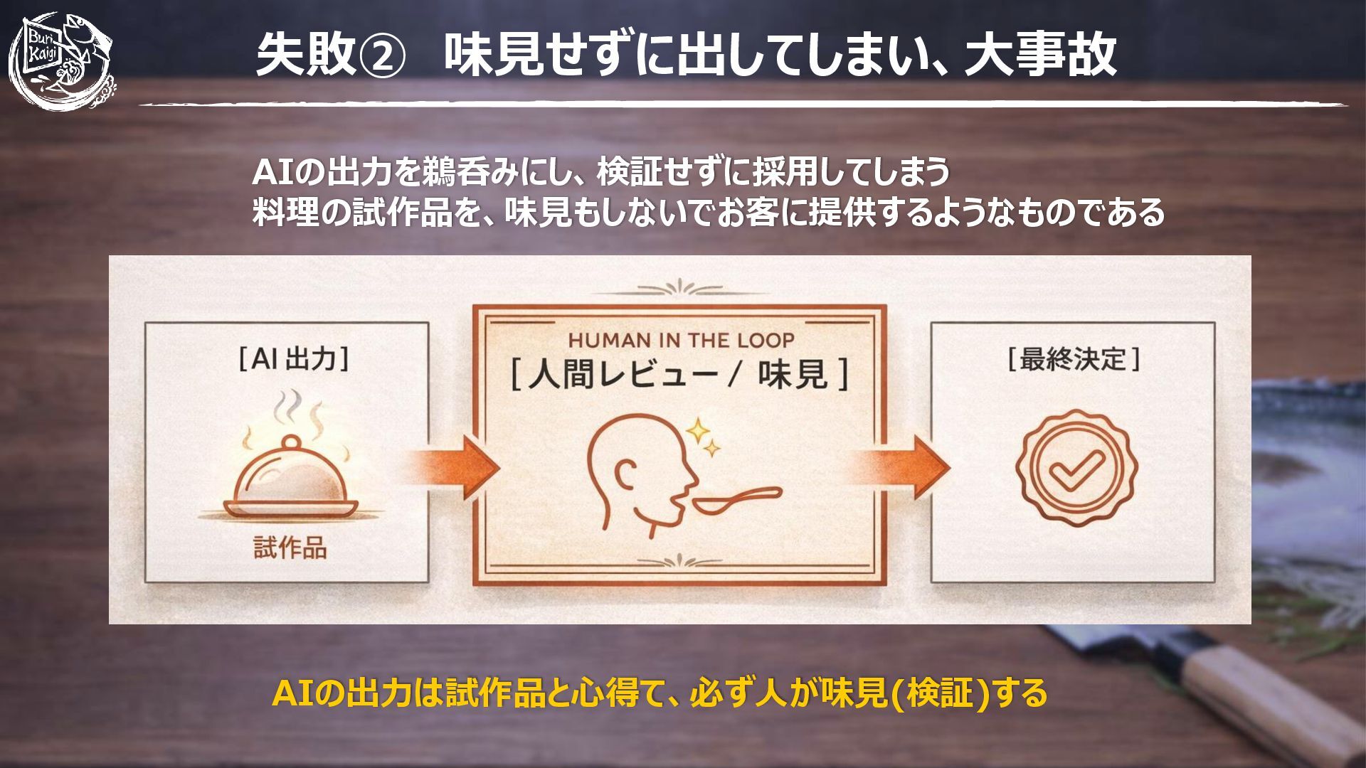 失敗② 味見せずに出してしまい、大事故 AIの出力を鵜呑みにし、検証せずに採用してしまう 料理の試作品を、味見もしないでお客に提供するようなものである AIの出力は試作品と心得て、必ず人が味見(検証)する