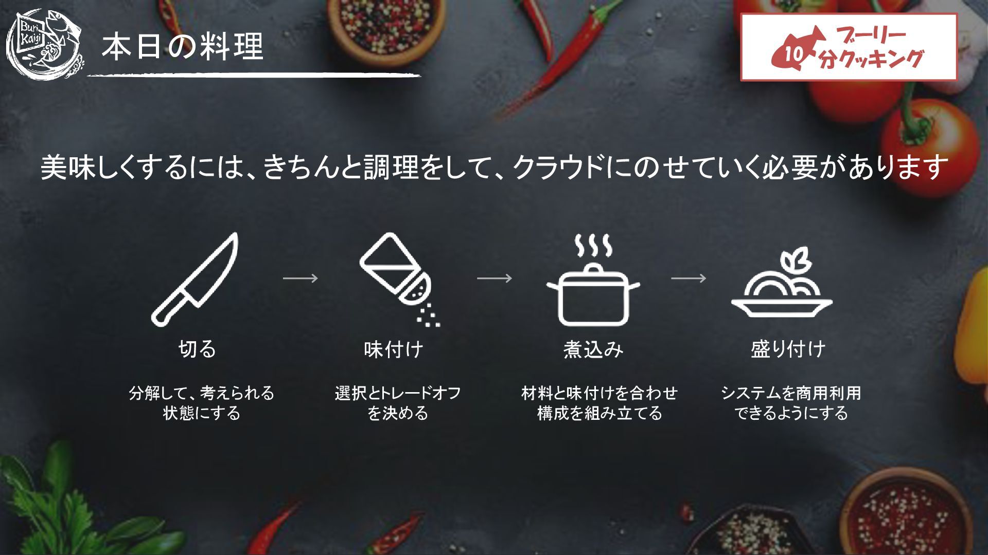 選択とトレードオフ を決める 材料と味付けを合わせ 構成を組み立てる システムを商用利用 できるようにする 美味しくするには、きちんと調理をして、クラウドにのせていく必要があります