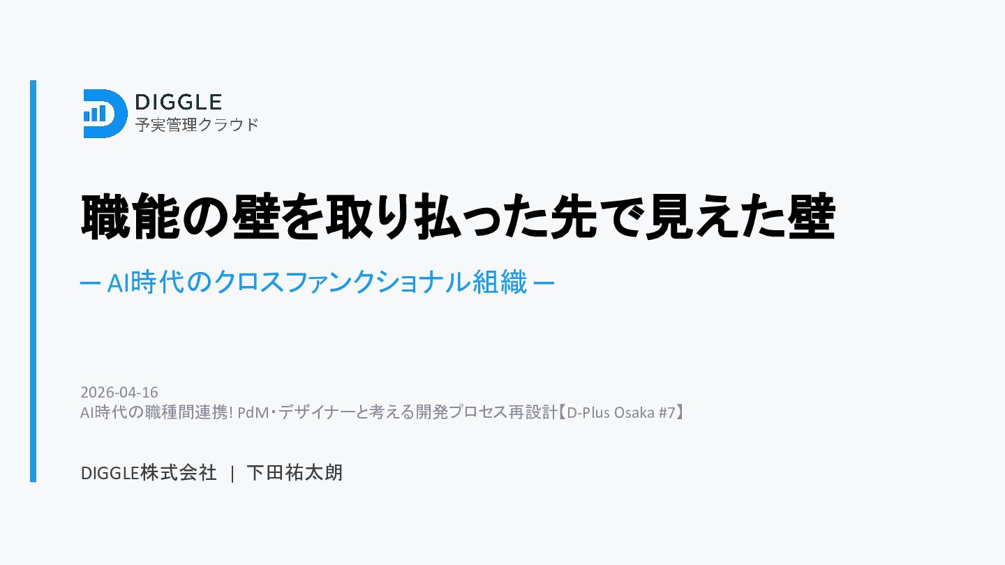 職能の壁を取り払った先で見えた壁 ─ AI時代のクロスファンクショナル組織 ─ 2026-04-16 AI時代の職種間連携! PdM・デザイナーと考える開発プロセス再設計【D-Plus Osaka #7】 DIGGLE株式会社