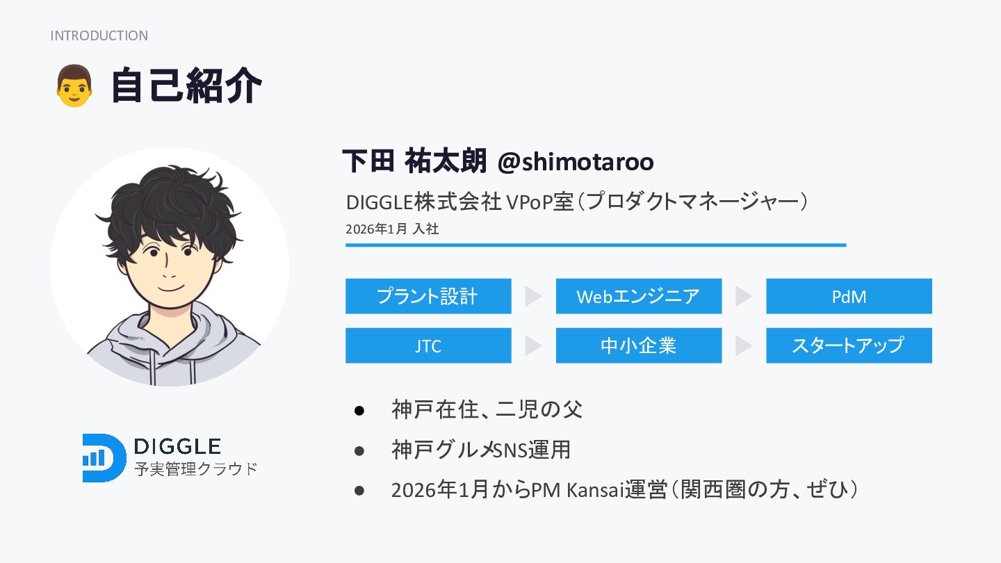 Webエンジニア PdM MISSION JTC 中小企業 スタートアップ • 神戸在住、二児の父 • 神戸グルメSNS運用 • 2026年1月からPM Kansai運営(関西圏の方、ぜひ) 2026年1月 入社
