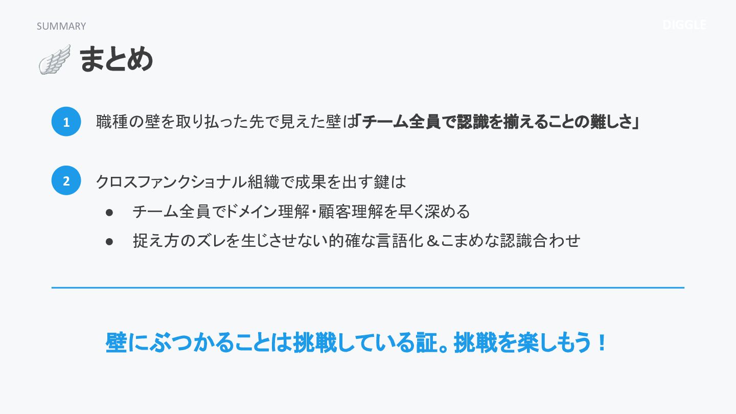 DIGGLE SUMMARY 🪽 まとめ 1 2 クロスファンクショナル組織で成果を出す鍵は • チーム全員でドメイン理解・顧客理解を早く深める •