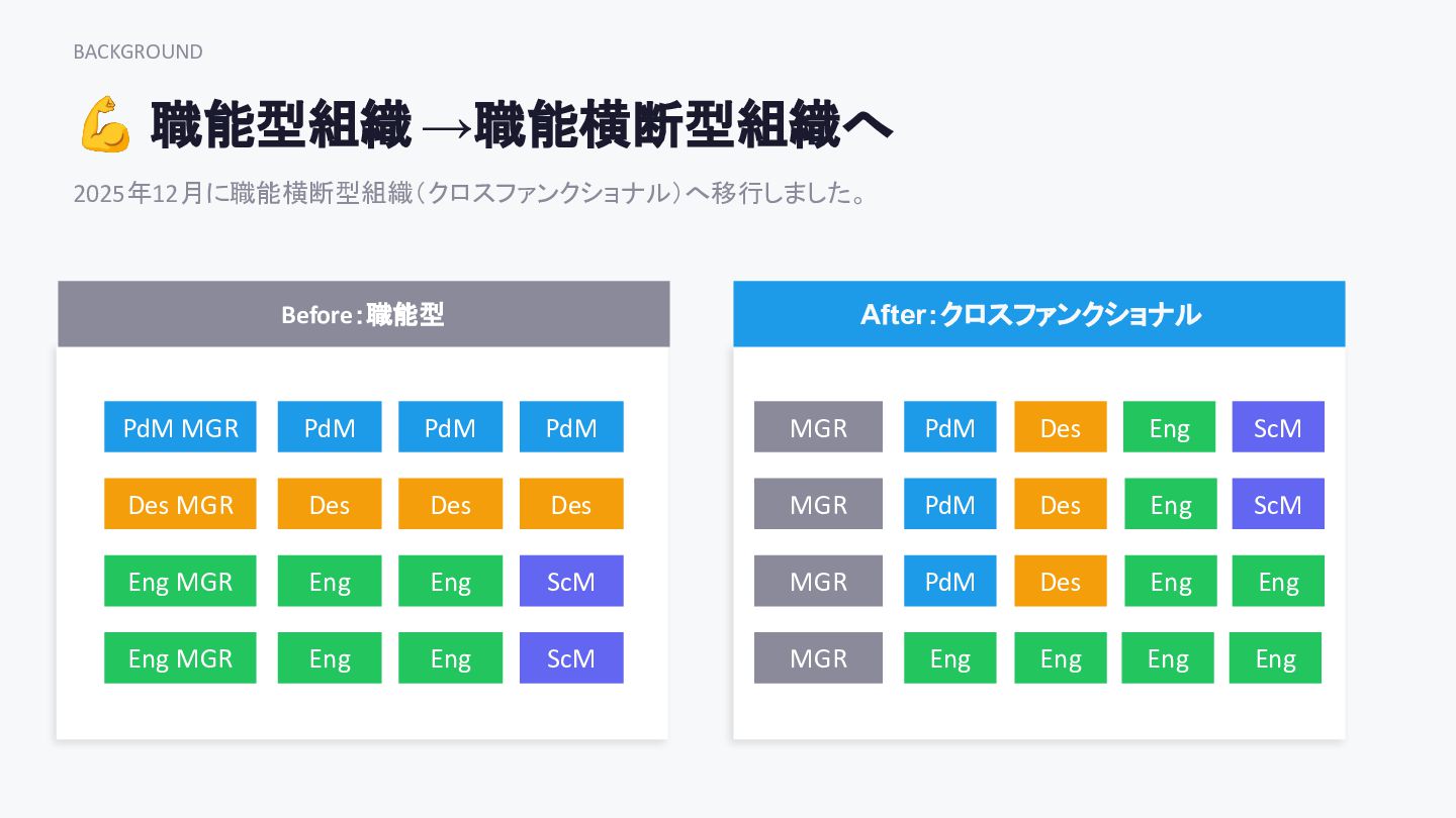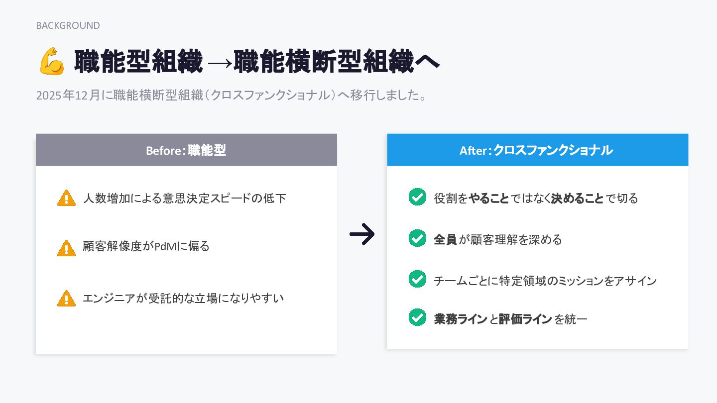 BACKGROUND 💪 職能型組織 →職能横断型組織へ 2025年12月に職能横断型組織( クロスファンクショナル)へ移行しました。 Before:職能型 人数増加による意思決定スピードの低下 エンジニアが受託的な立場になりやすい 顧客解像度がPdMに偏る
