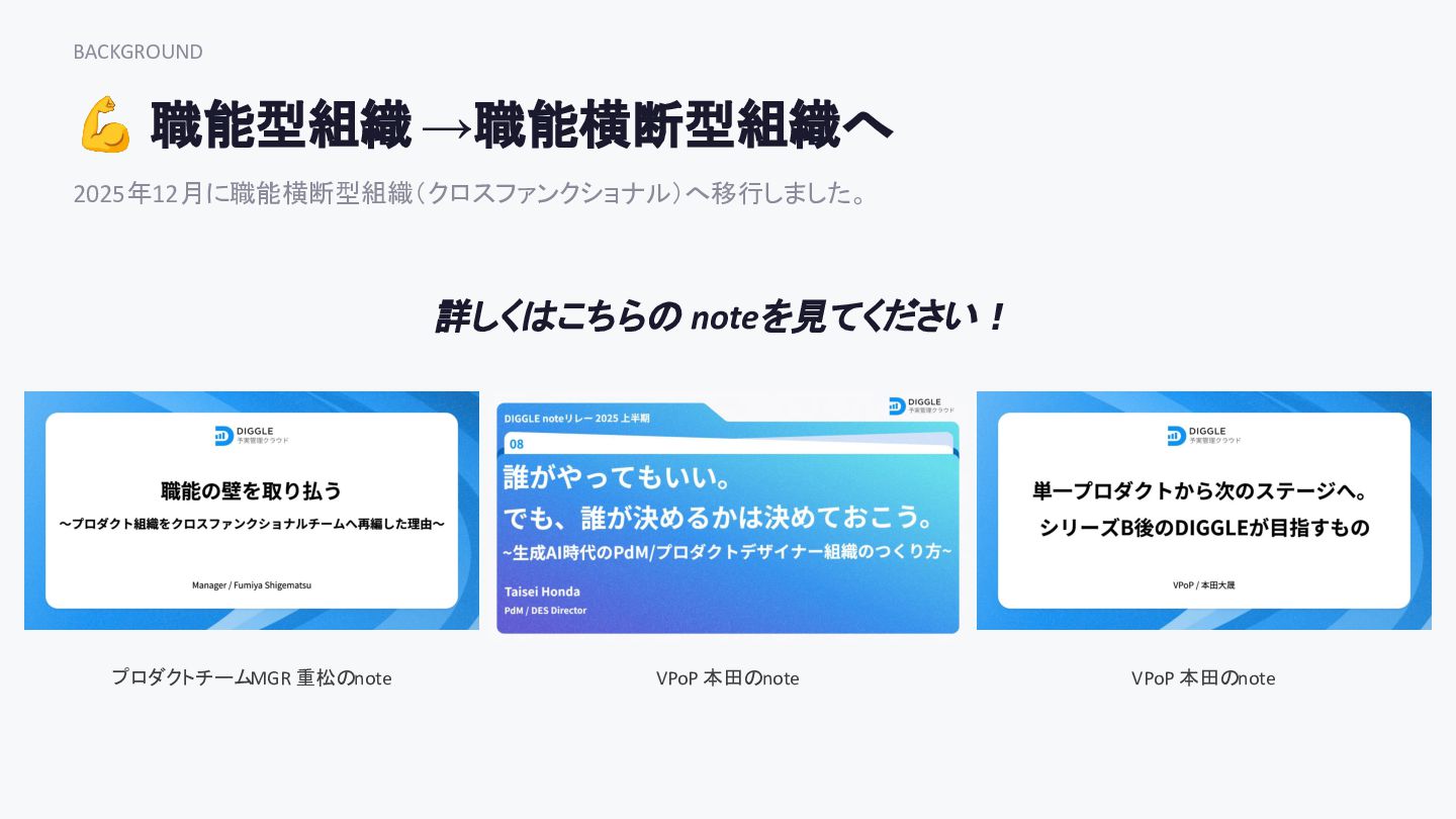 BACKGROUND 💪 職能型組織 →職能横断型組織へ 2025年12月に職能横断型組織( クロスファンクショナル)へ移行しました。 詳しくはこちらの noteを見てください! プロダクトチームMGR 重松のnote