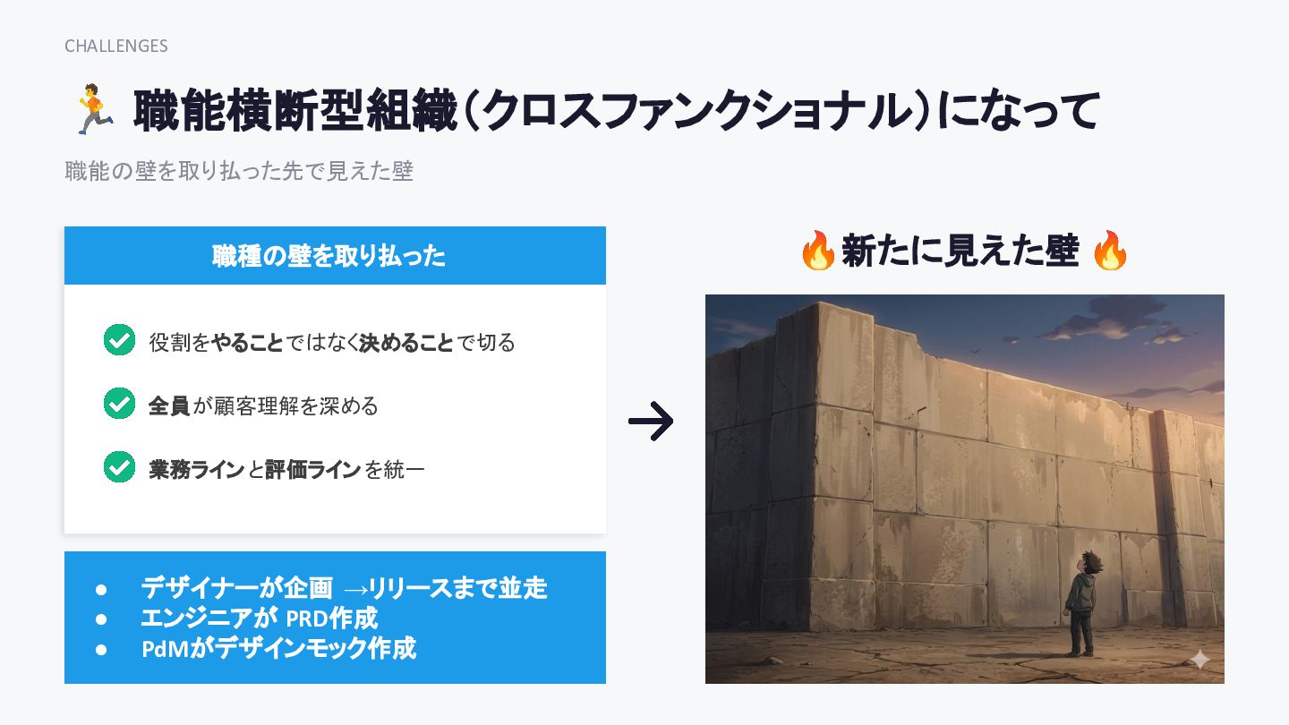 🔥新たに見えた壁 🔥 • デザイナーが企画 →リリースまで並走 • エンジニアが PRD作成 • PdMがデザインモック作成 職能の壁を取り払った先で見えた壁