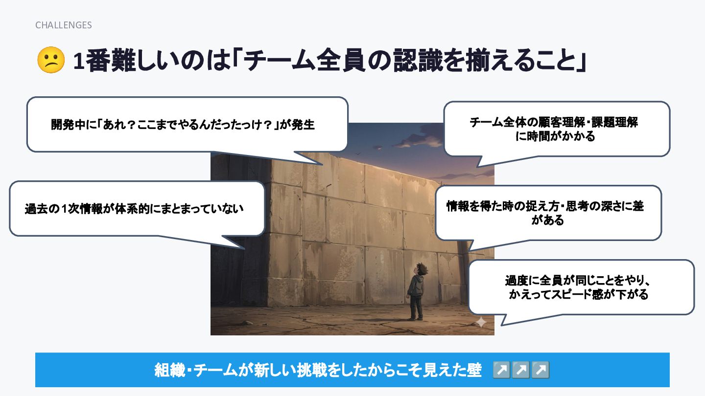 CHALLENGES 😕 1番難しいのは「チーム全員の認識を揃えること」 チーム全体の顧客理解・課題理解 に時間がかかる 開発中に「あれ?ここまでやるんだったっけ?」が発生 過去の1次情報が体系的にまとまっていない 情報を得た時の捉え方・思考の深さに差 がある 過度に全員が同じことをやり、