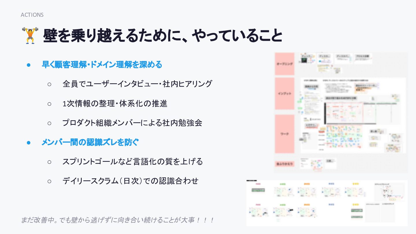 ACTIONS 🏋 壁を乗り越えるために、やっていること まだ改善中。でも壁から逃げずに向き合い続けることが大事!!! • 早く顧客理解・ドメイン理解を深める ◦ 全員でユーザーインタビュー・社内ヒアリング ◦ 1次情報の整理・体系化の推進