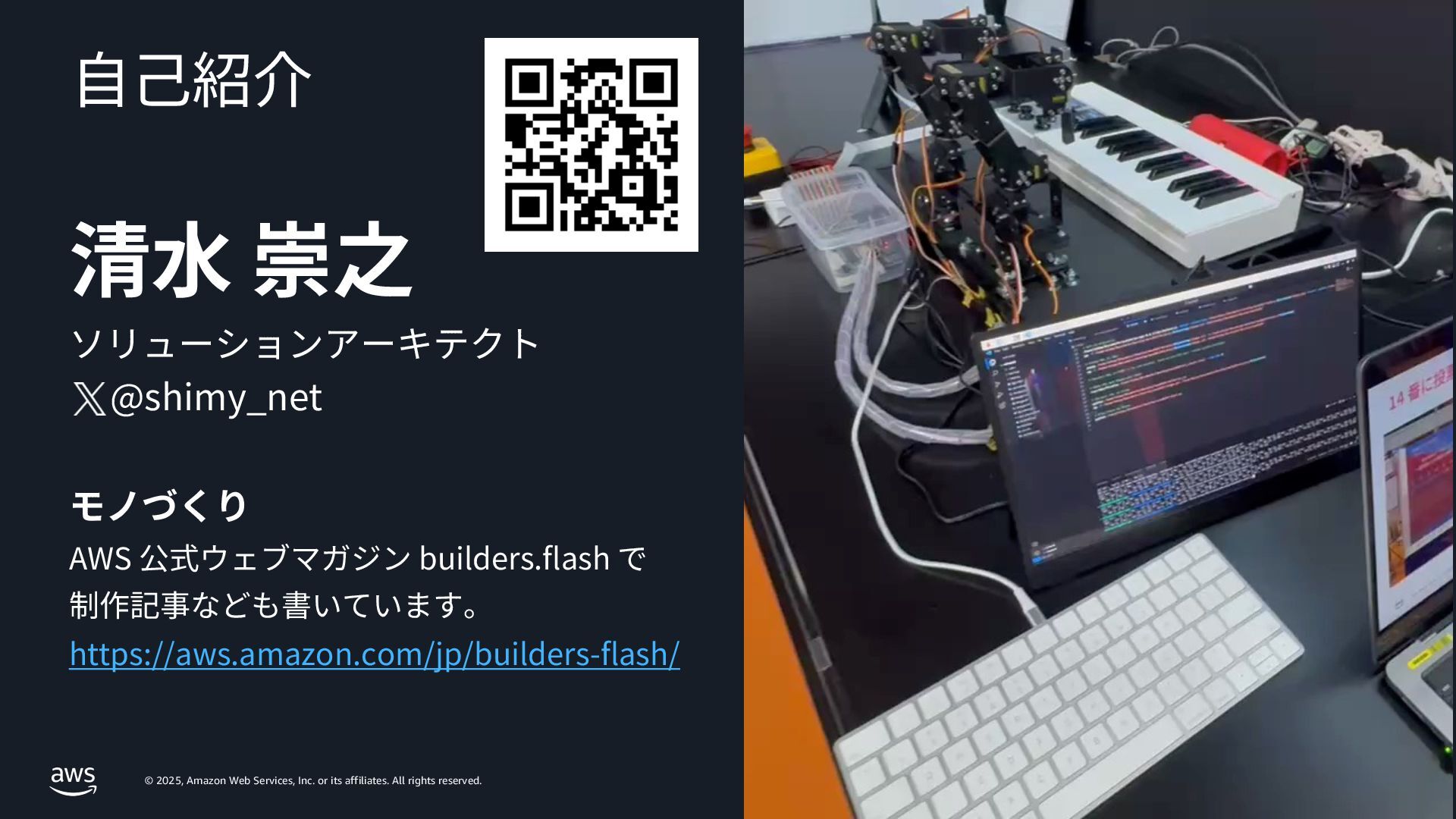 rights reserved. ⾃⼰紹介 清⽔ 崇之 ソリューションアーキテクト @shimy_net モノづくり AWS 公式ウェブマガジン builders.flash で 制作記事なども書いています。 https://aws.amazon.com/jp/builders-flash/