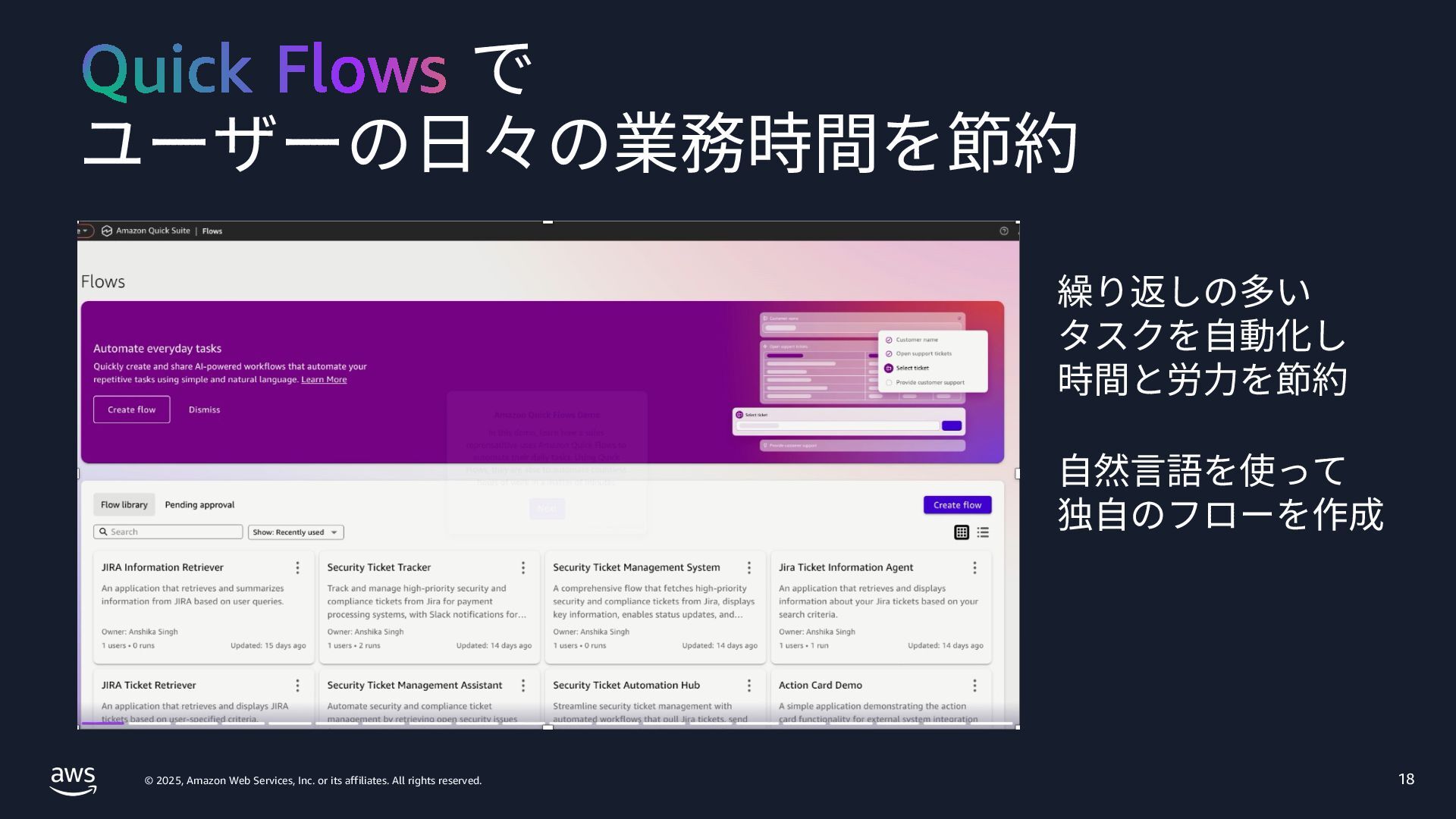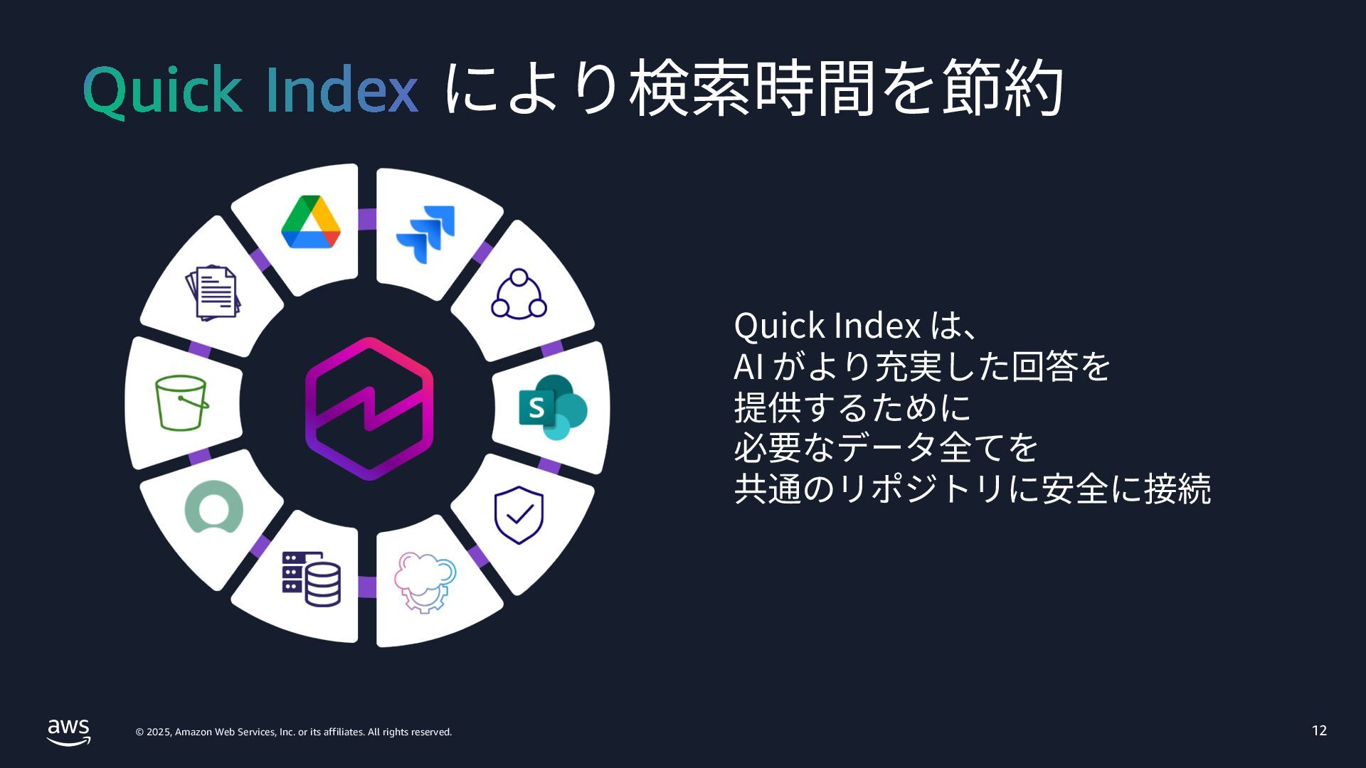 rights reserved. の機能まとめ 情報の分散 データ分析の複雑性 洞察の困難さ シンプルなタスクの ⾮効率性 複雑なプロセスの 実⾏困難 情報収集 分析 実⾏ Quick Index Spaces Quick Sight Quick Flows Quick Automate Quick Research Chat Agents 11
