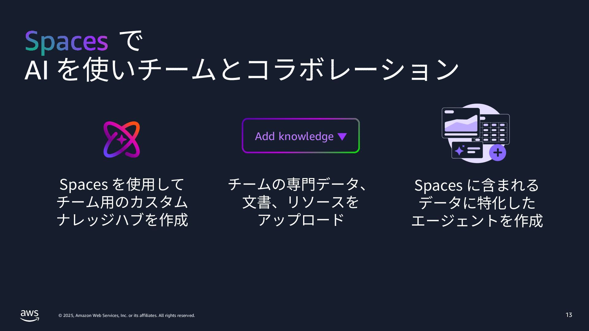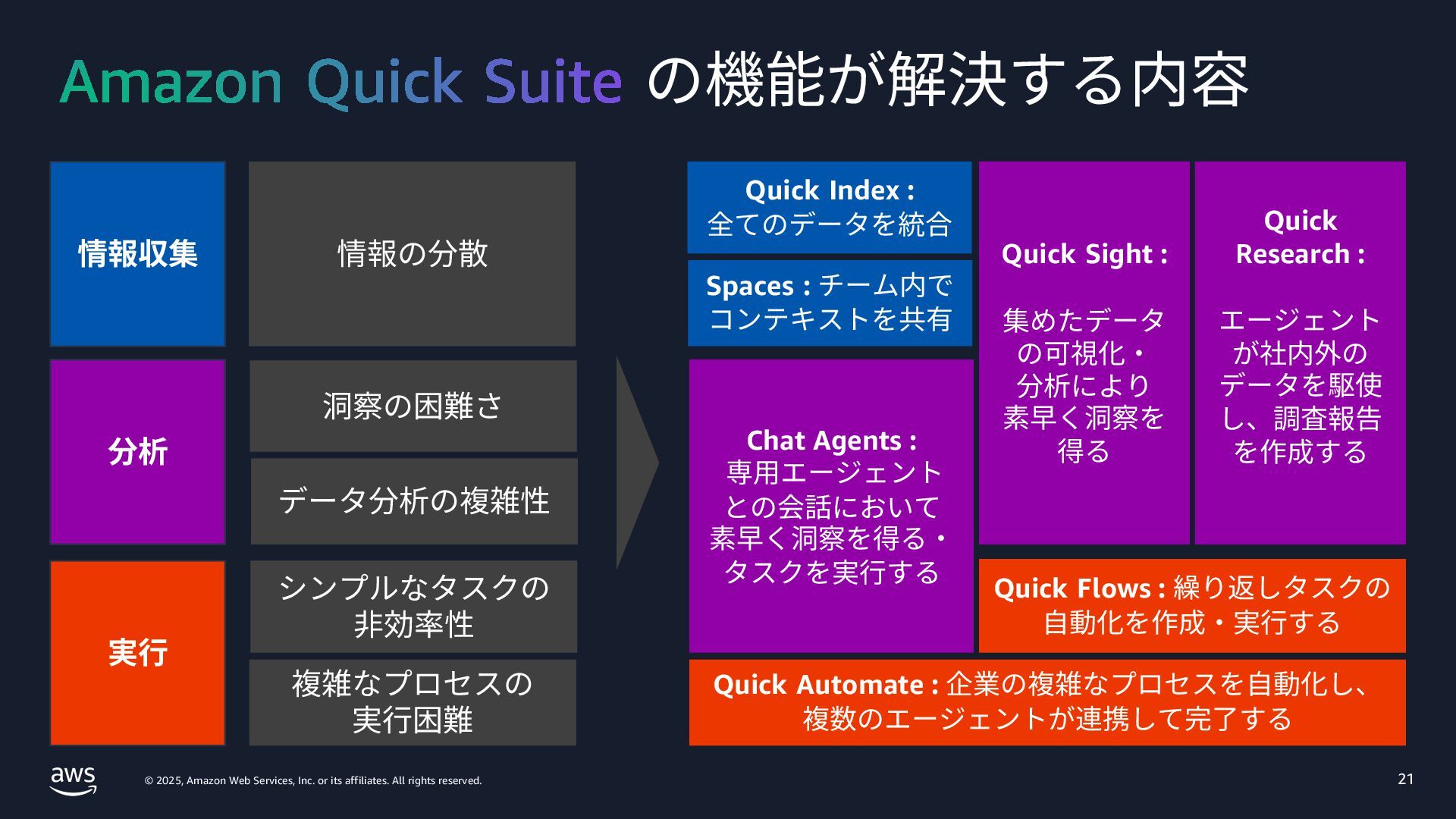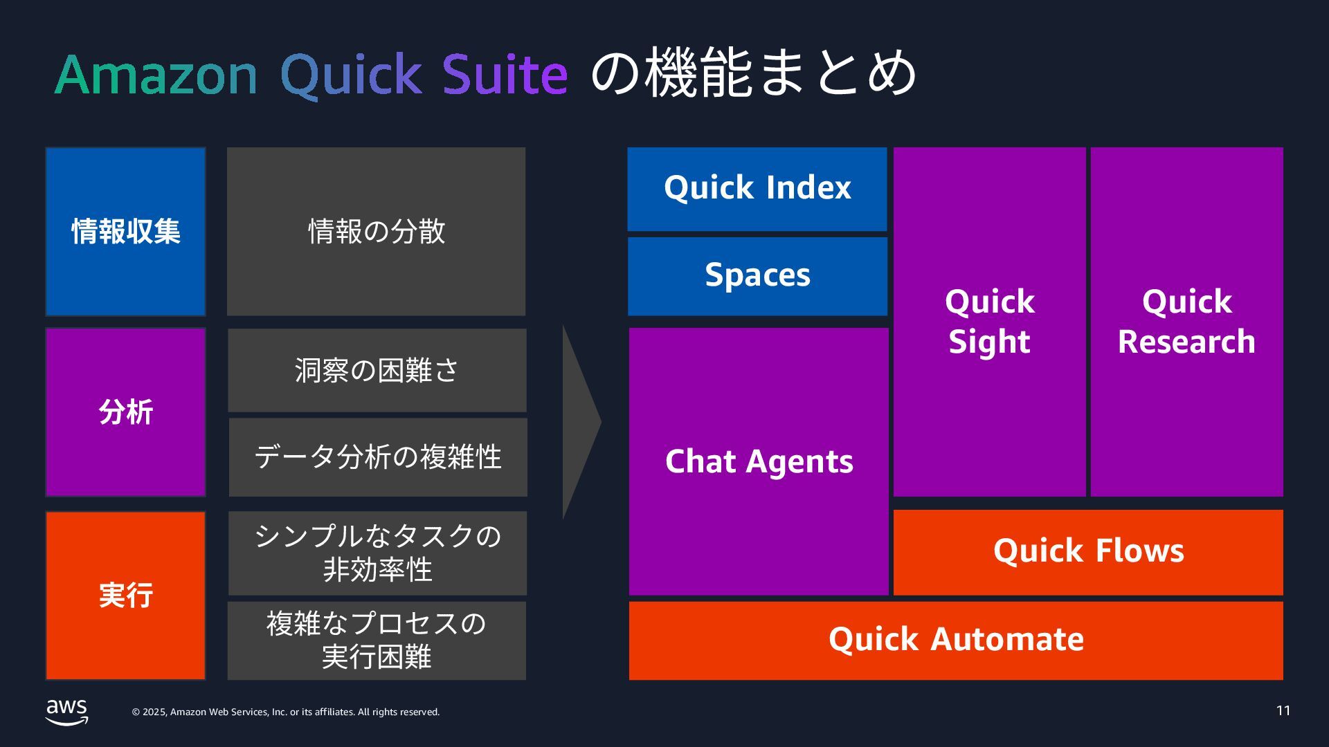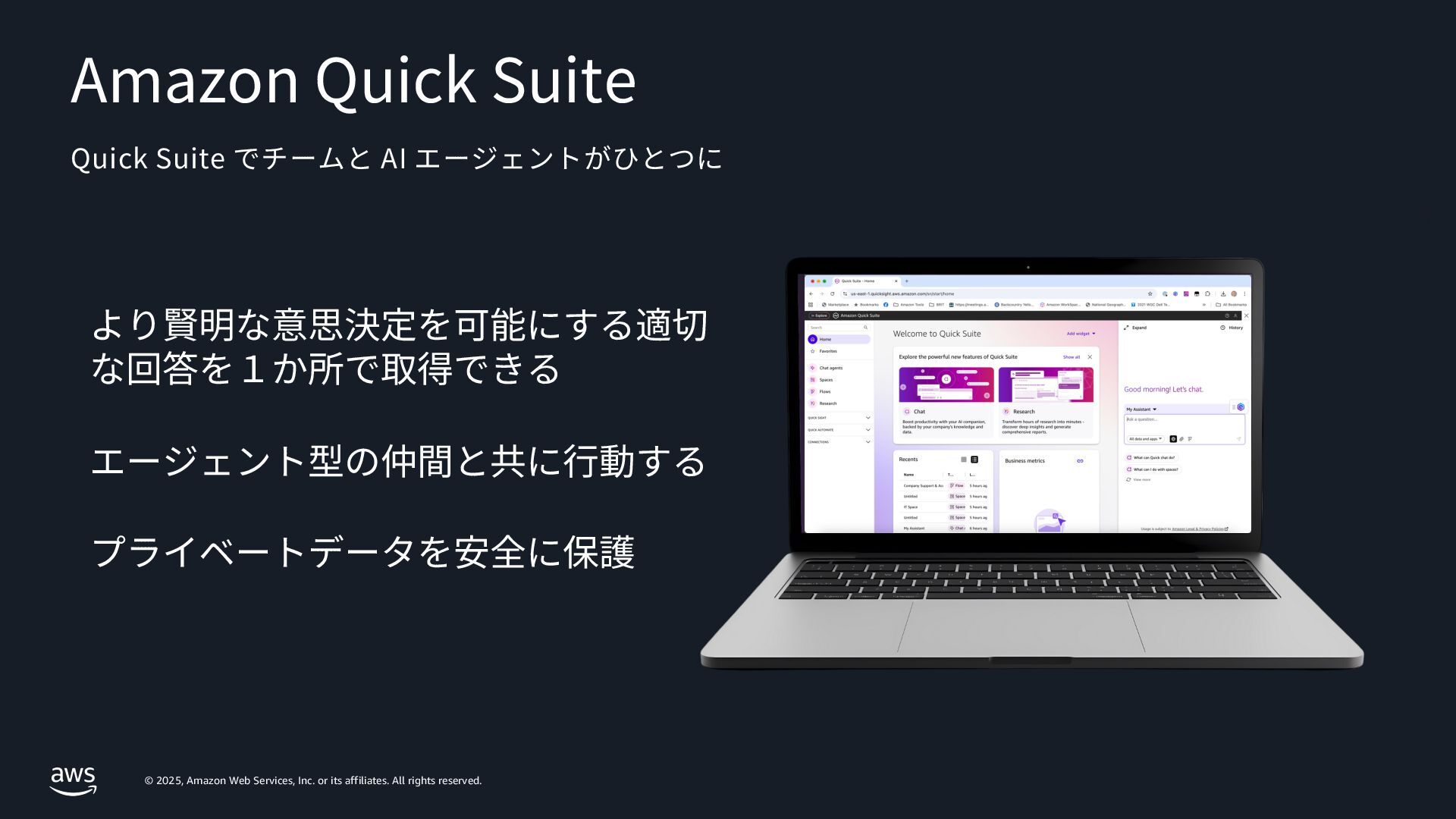 rights reserved. Amazon Quick Suite より賢明な意思決定を可能にする適切 な回答を1か所で取得できる エージェント型の仲間と共に⾏動する プライベートデータを安全に保護 Quick Suite でチームと AI エージェントがひとつに