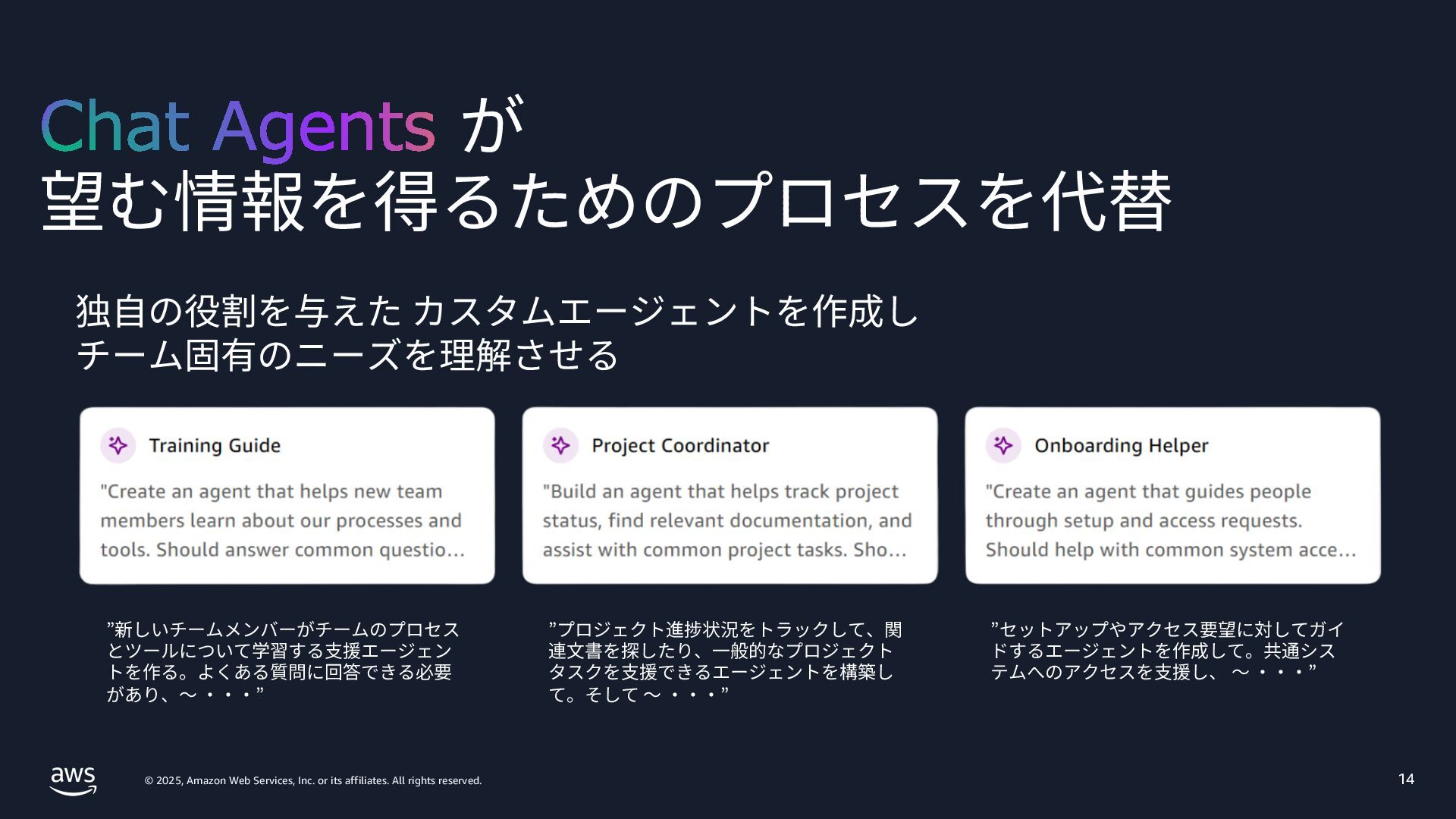 rights reserved. で AI を使いチームとコラボレーション Spaces に含まれる データに特化した エージェントを作成 Spaces を使⽤して チーム⽤のカスタム ナレッジハブを作成 チームの専⾨データ、 ⽂書、リソースを アップロード Add knowledge 13