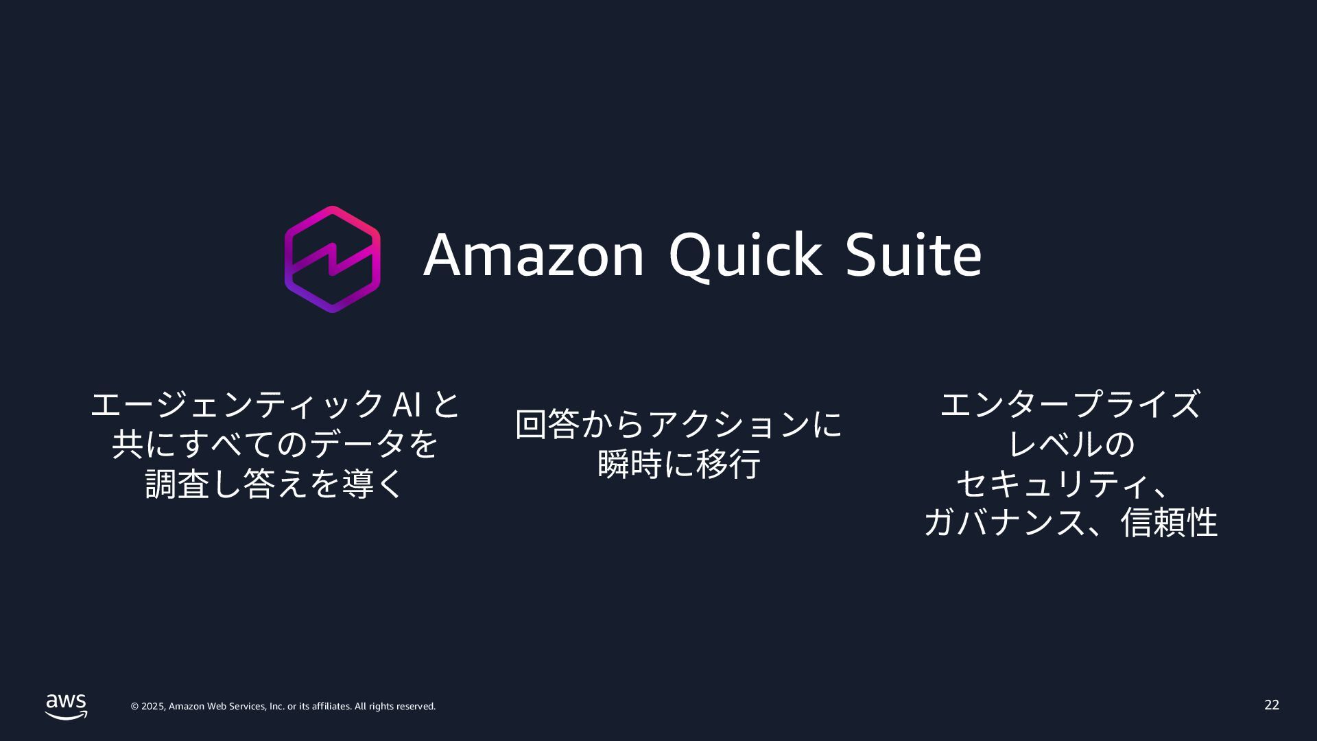 rights reserved. の機能が解決する内容 Quick Index : 全てのデータを統合 Spaces : チーム内で コンテキストを共有 Quick Sight : 集めたデータ の可視化‧ 分析により 素早く洞察を 得る Quick Flows : 繰り返しタスクの ⾃動化を作成‧実⾏する Quick Automate : 企業の複雑なプロセスを⾃動化し、 複数のエージェントが連携して完了する Quick Research : エージェント が社内外の データを駆使 し、調査報告 を作成する Chat Agents : 専⽤エージェント との会話において 素早く洞察を得る‧ タスクを実⾏する 情報の分散 データ分析の複雑性 洞察の困難さ シンプルなタスクの ⾮効率性 複雑なプロセスの 実⾏困難 情報収集 分析 実⾏ 21