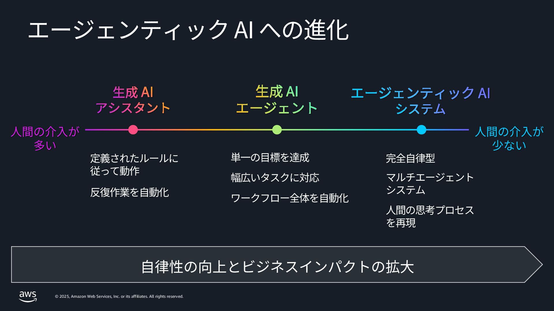 rights reserved. エージェンティック AI への進化 ⼈間の介⼊が 多い ⼈間の介⼊が 少ない 定義されたルールに 従って動作 反復作業を⾃動化 完全⾃律型 ⼈間の思考プロセス を再現 マルチエージェント システム 単⼀の⽬標を達成 幅広いタスクに対応 ワークフロー全体を⾃動化 ⾃律性の向上とビジネスインパクトの拡⼤