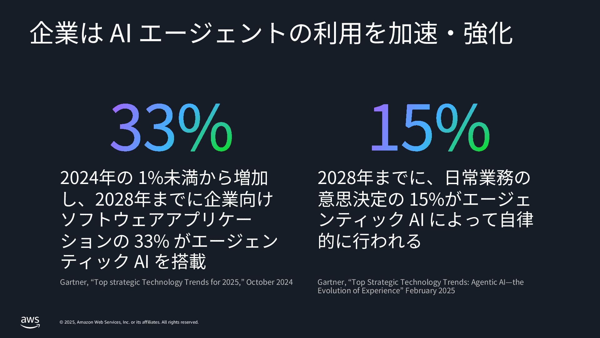 rights reserved. 企業は AI エージェントの利⽤を加速‧強化 Gartner, “Top strategic Technology Trends for 2025,” October 2024 Gartner, “Top Strategic Technology Trends: Agentic AI—the Evolution of Experience” February 2025 2024年の 1%未満から増加 し、2028年までに企業向け ソフトウェアアプリケー ションの 33% がエージェン ティック AI を搭載 2028年までに、⽇常業務の 意思決定の 15%がエージェ ンティック AI によって⾃律 的に⾏われる