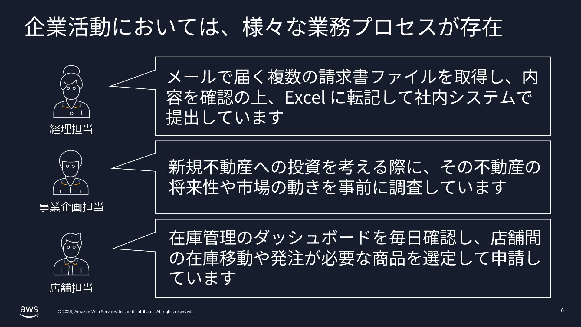 rights reserved. 企業活動においては、様々な業務プロセスが存在 メールで届く複数の請求書ファイルを取得し、内 容を確認の上、Excel に転記して社内システムで 提出しています 新規不動産への投資を考える際に、その不動産の 将来性や市場の動きを事前に調査しています 在庫管理のダッシュボードを毎⽇確認し、店舗間 の在庫移動や発注が必要な商品を選定して申請し ています 経理担当 事業企画担当 店舗担当 6