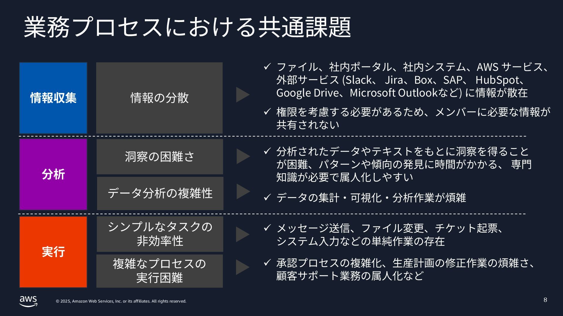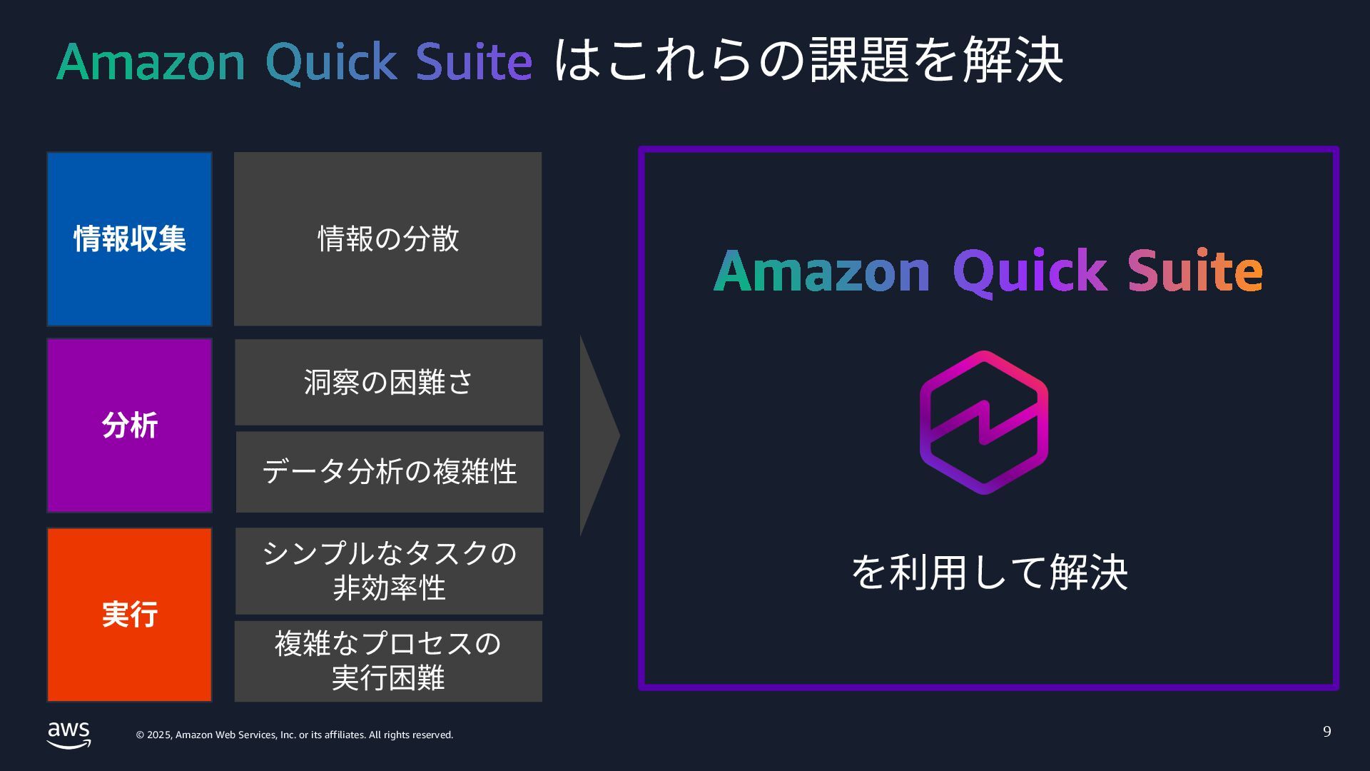 rights reserved. 業務プロセスにおける共通課題 ü ファイル、社内ポータル、社内システム、AWS サービス、 外部サービス (Slack、 Jira、Box、SAP、 HubSpot、 Google Drive、Microsoft Outlookなど) に情報が散在 ü 分析されたデータやテキストをもとに洞察を得ること が困難、パターンや傾向の発⾒に時間がかかる、 専⾨ 知識が必要で属⼈化しやすい ü メッセージ送信、ファイル変更、チケット起票、 システム⼊⼒などの単純作業の存在 ü 承認プロセスの複雑化、⽣産計画の修正作業の煩雑さ、 顧客サポート業務の属⼈化など 情報の分散 データ分析の複雑性 洞察の困難さ シンプルなタスクの ⾮効率性 複雑なプロセスの 実⾏困難 8 情報収集 分析 実⾏ ü データの集計‧可視化‧分析作業が煩雑 ü 権限を考慮する必要があるため、メンバーに必要な情報が 共有されない