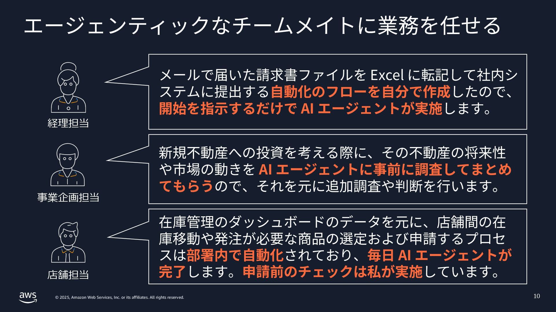 rights reserved. エージェンティックなチームメイトに業務を任せる メールで届いた請求書ファイルを Excel に転記して社内シ ステムに提出する⾃動化のフローを⾃分で作成したので、 開始を指⽰するだけで AI エージェントが実施します。 新規不動産への投資を考える際に、その不動産の将来性 や市場の動きを AI エージェントに事前に調査してまとめ てもらうので、それを元に追加調査や判断を⾏います。 在庫管理のダッシュボードのデータを元に、店舗間の在 庫移動や発注が必要な商品の選定および申請するプロセ スは部署内で⾃動化されており、毎⽇ AI エージェントが 完了します。申請前のチェックは私が実施しています。 経理担当 事業企画担当 店舗担当 10