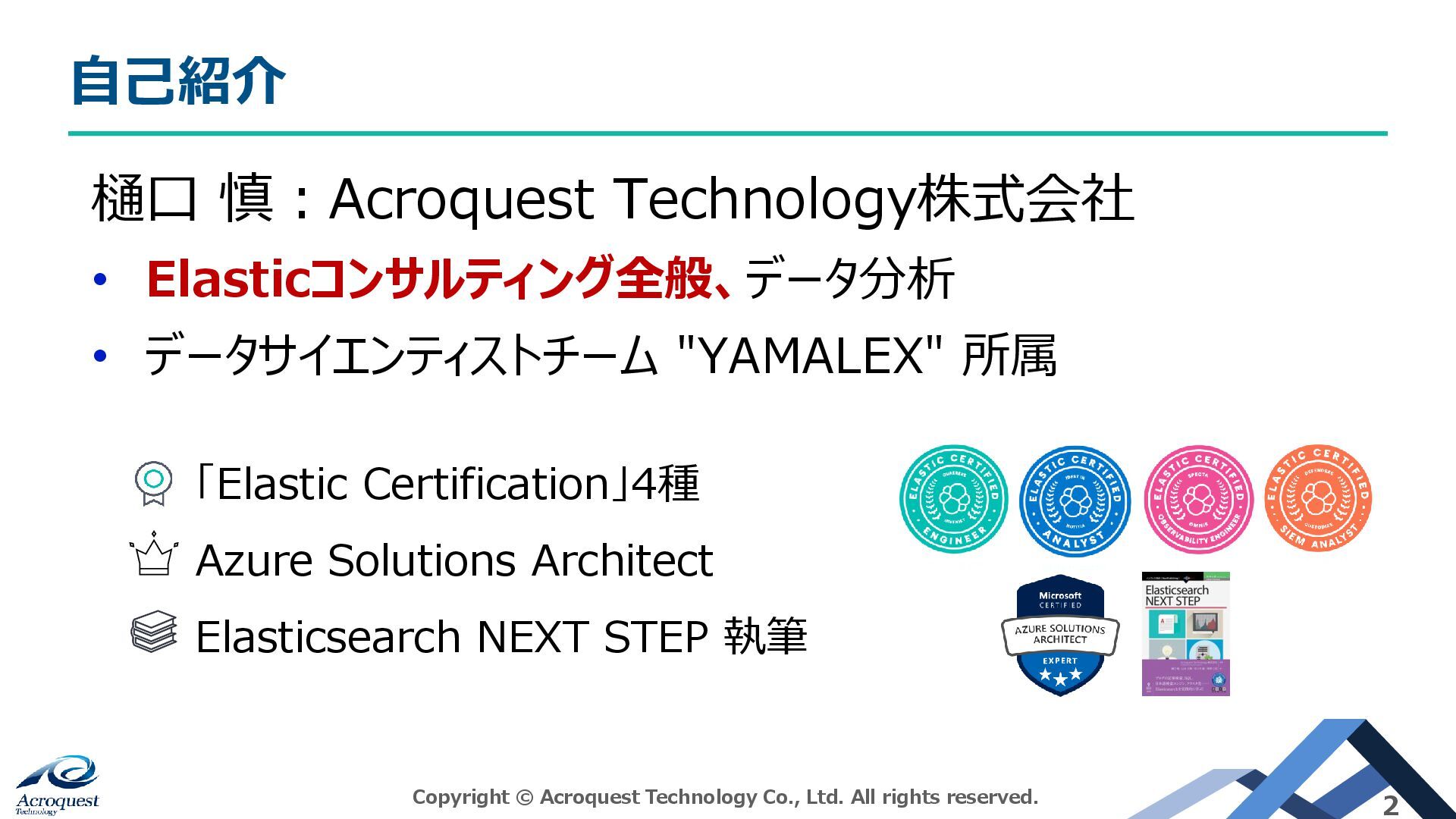 「Elastic Certification」4種 Azure Solutions Architect Elasticsearch NEXT STEP 執筆 Copyright © Acroquest Technology Co., Ltd. All rights reserved. 2