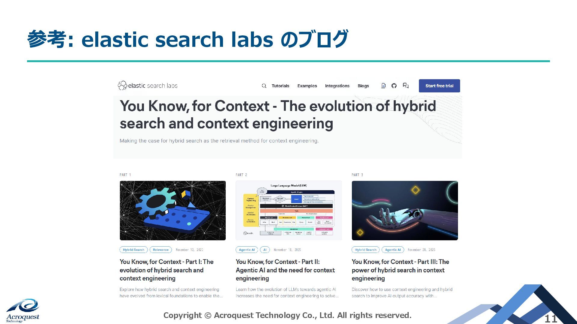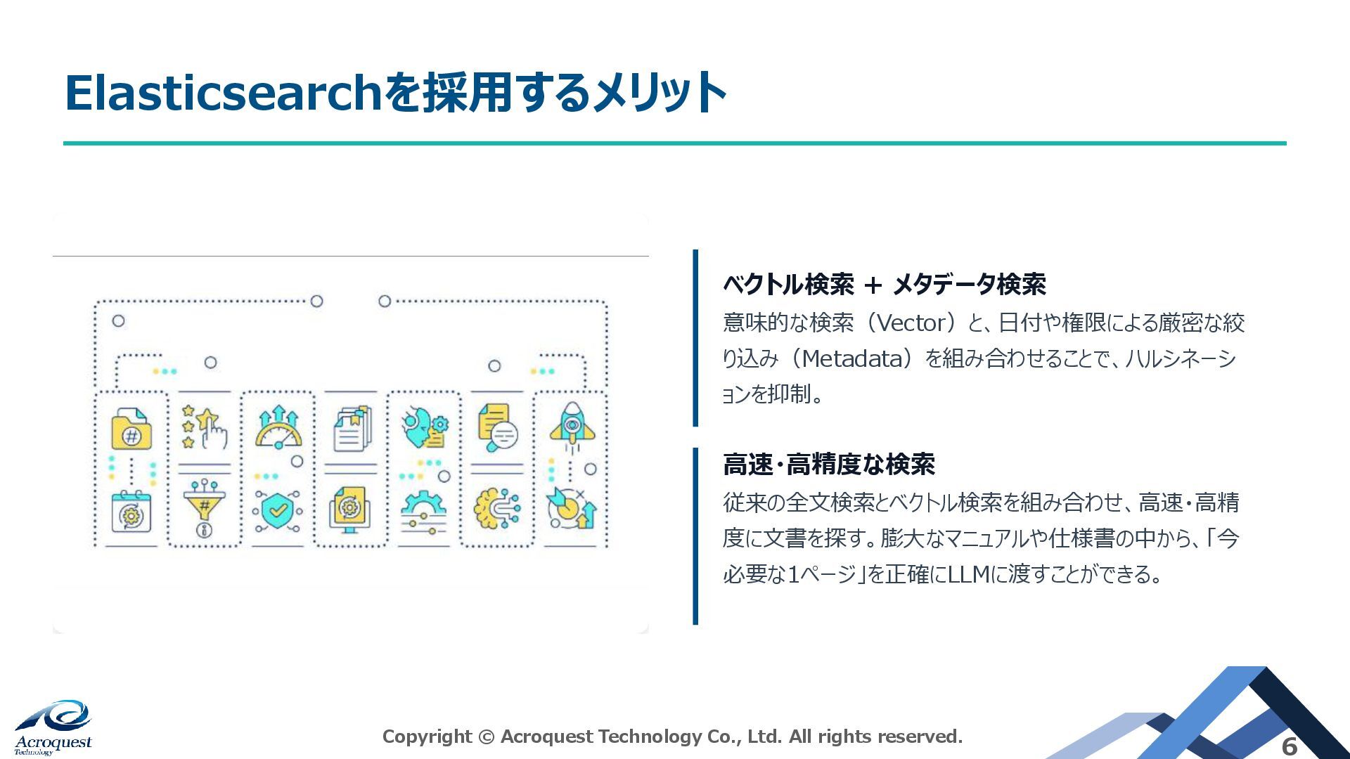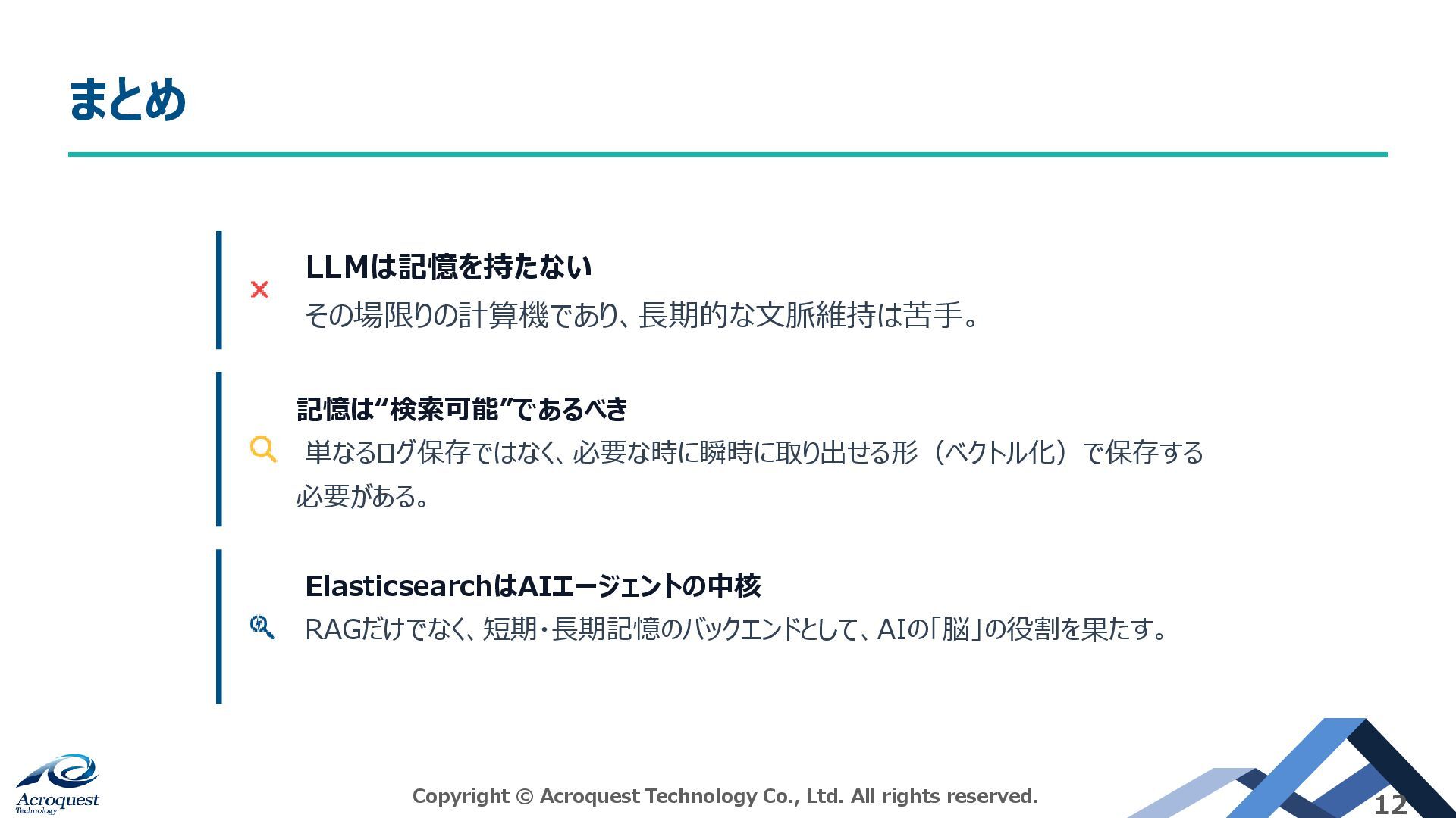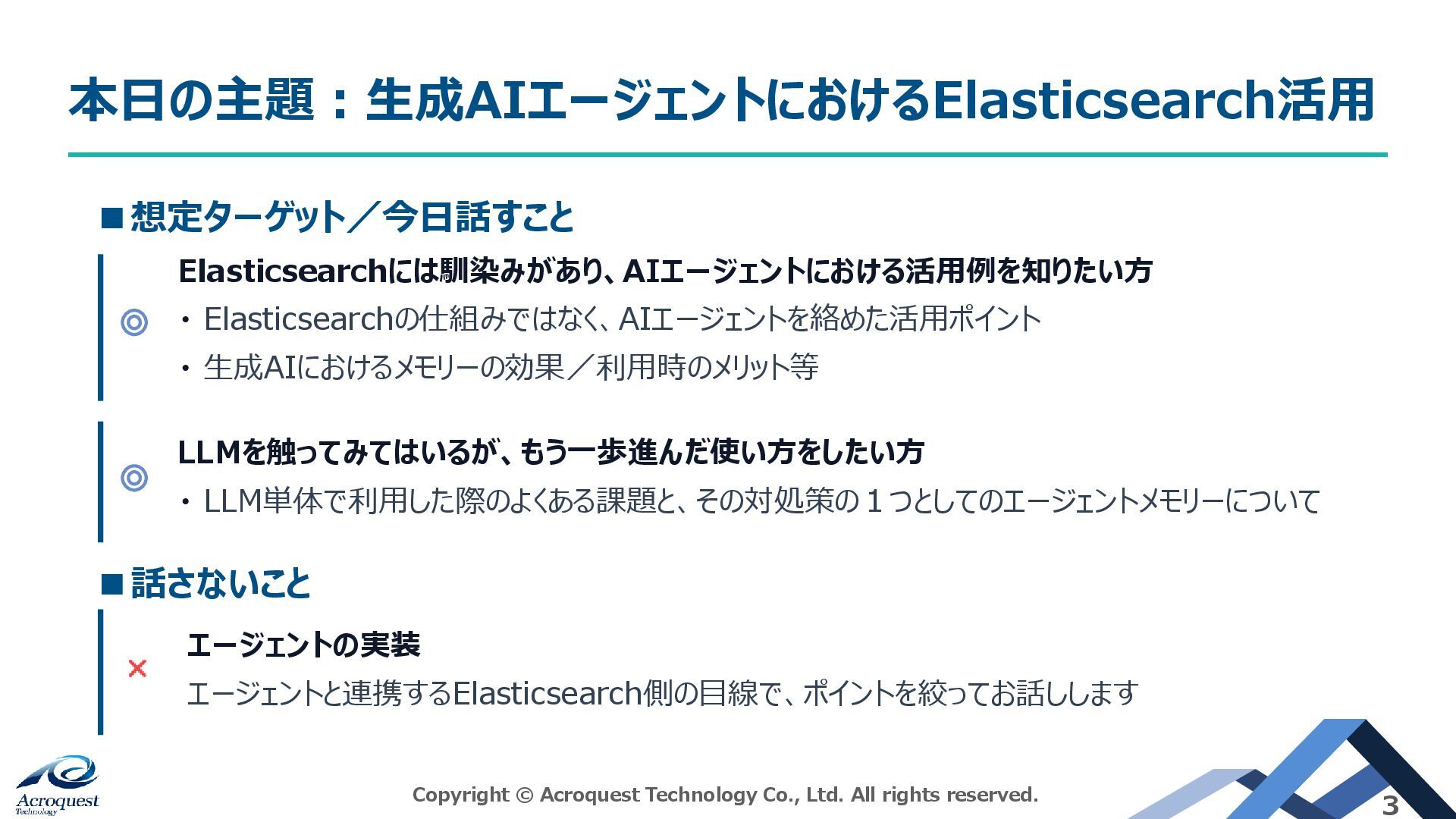 本日の主題:生成AIエージェントにおけるElasticsearch活用 Copyright © Acroquest Technology Co., Ltd. All rights reserved.