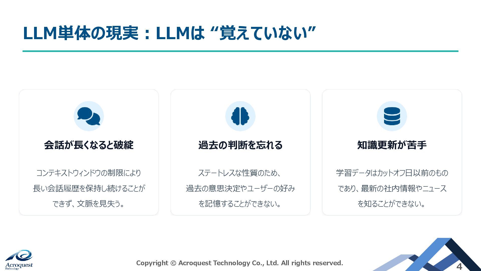 であり、最新の社内情報やニュース を知ることができない。 LLM単体の現実:LLMは “覚えていない” Copyright © Acroquest Technology Co., Ltd. All rights reserved. 4