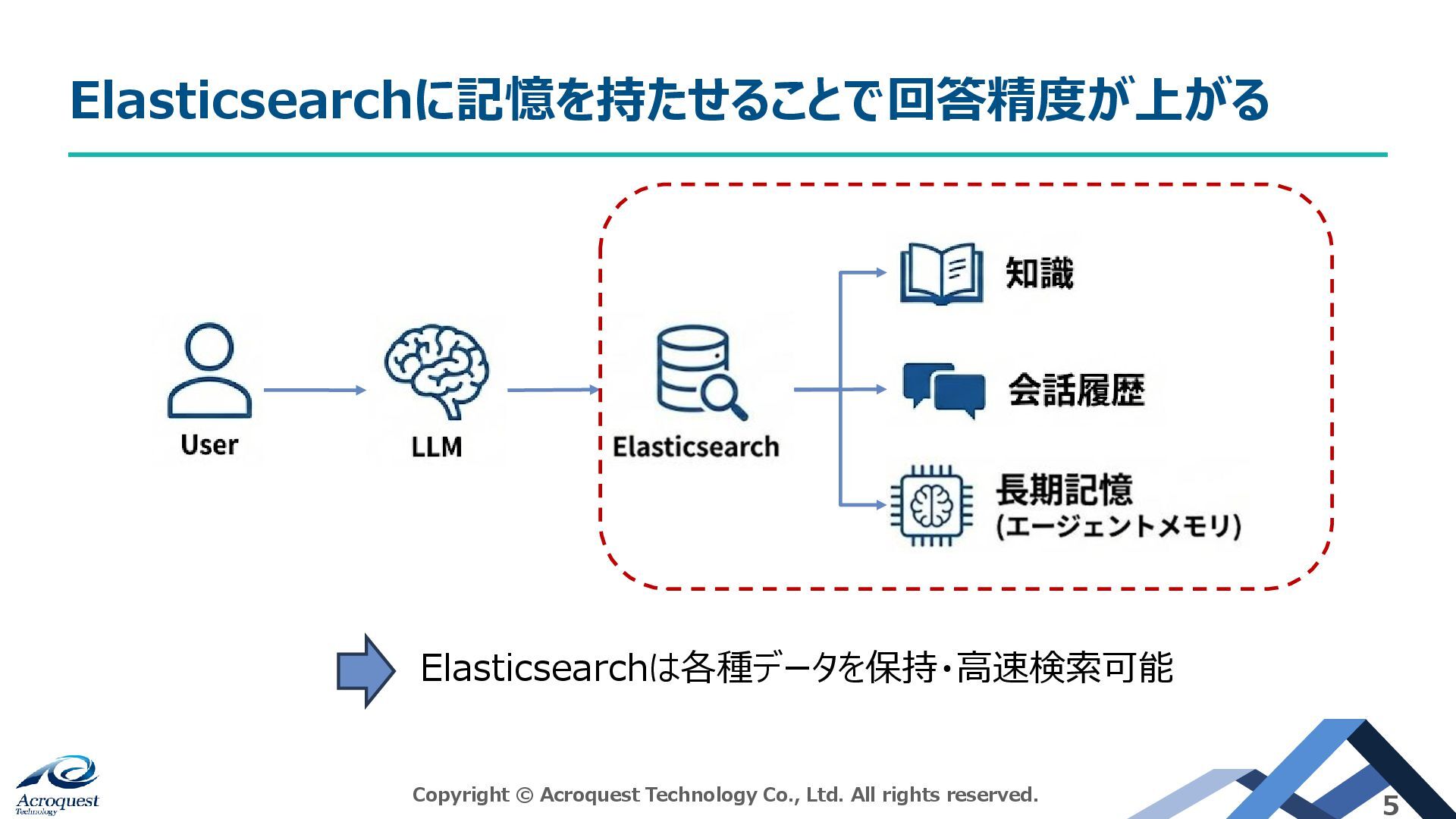 Elasticsearchは各種データを保持・高速検索可能 Elasticsearchに記憶を持たせることで回答精度が上がる Copyright © Acroquest Technology Co., Ltd. All rights