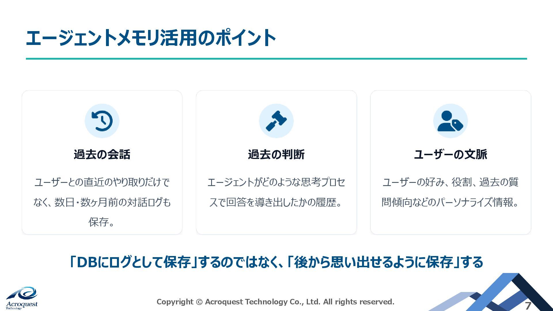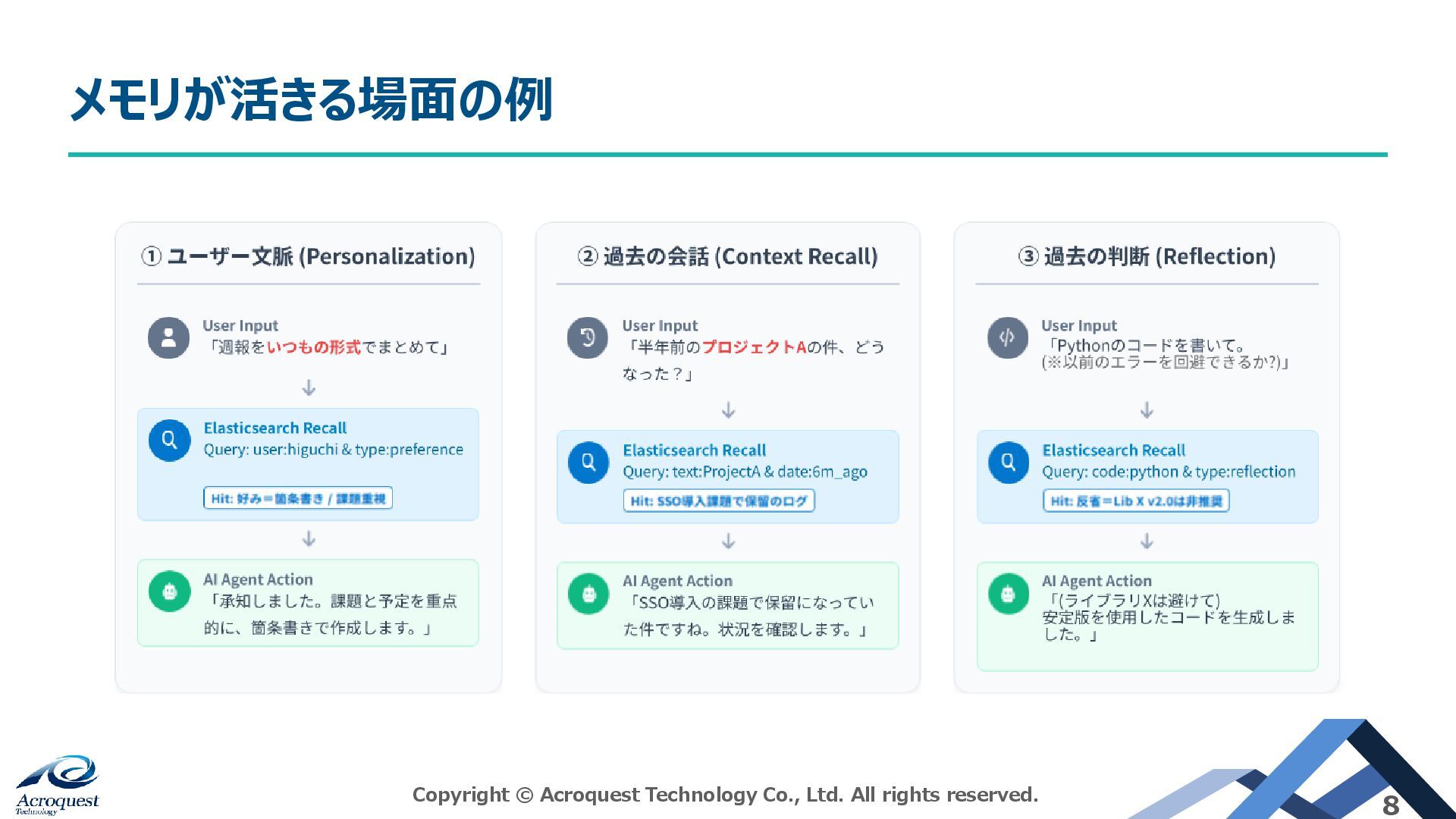 問傾向などのパーソナライズ情報。 エージェントメモリ活用のポイント Copyright © Acroquest Technology Co., Ltd. All rights reserved. 7
