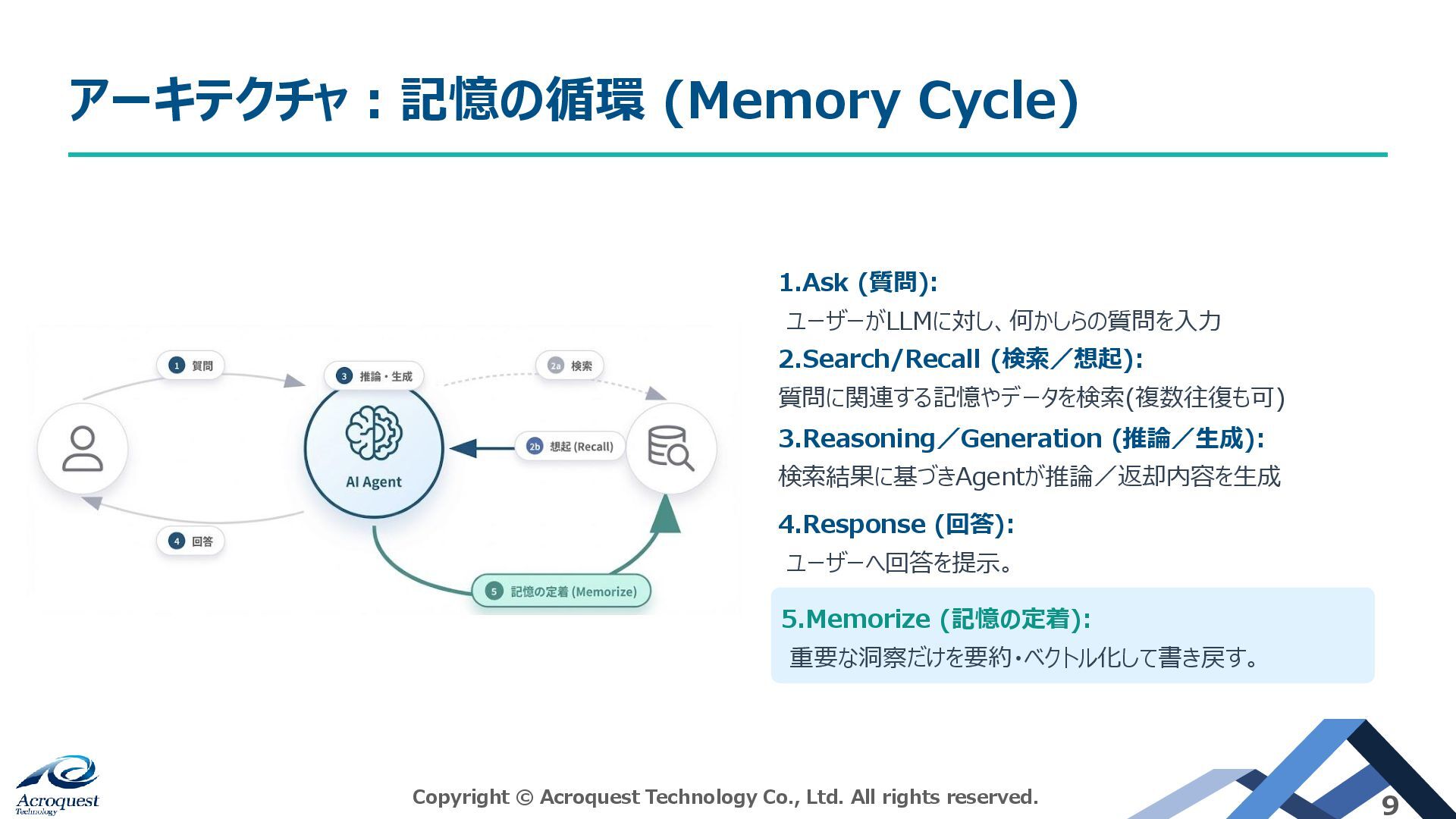 (推論/生成): 検索結果に基づきAgentが推論/返却内容を生成 5.Memorize (記憶の定着): 重要な洞察だけを要約・ベクトル化して書き戻す。 4.Response (回答): ユーザーへ回答を提示。 Copyright © Acroquest Technology Co., Ltd. All rights reserved. 9