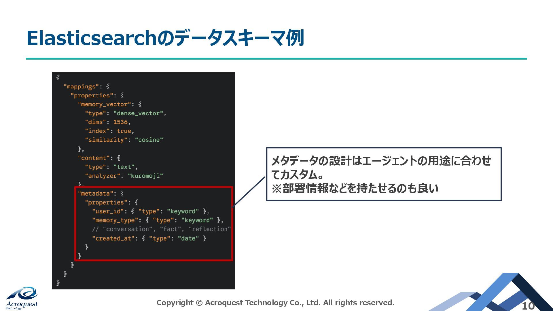 メタデータの設計はエージェントの用途に合わせ てカスタム。 ※部署情報などを持たせるのも良い Elasticsearchのデータスキーマ例 Copyright © Acroquest Technology Co., Ltd.