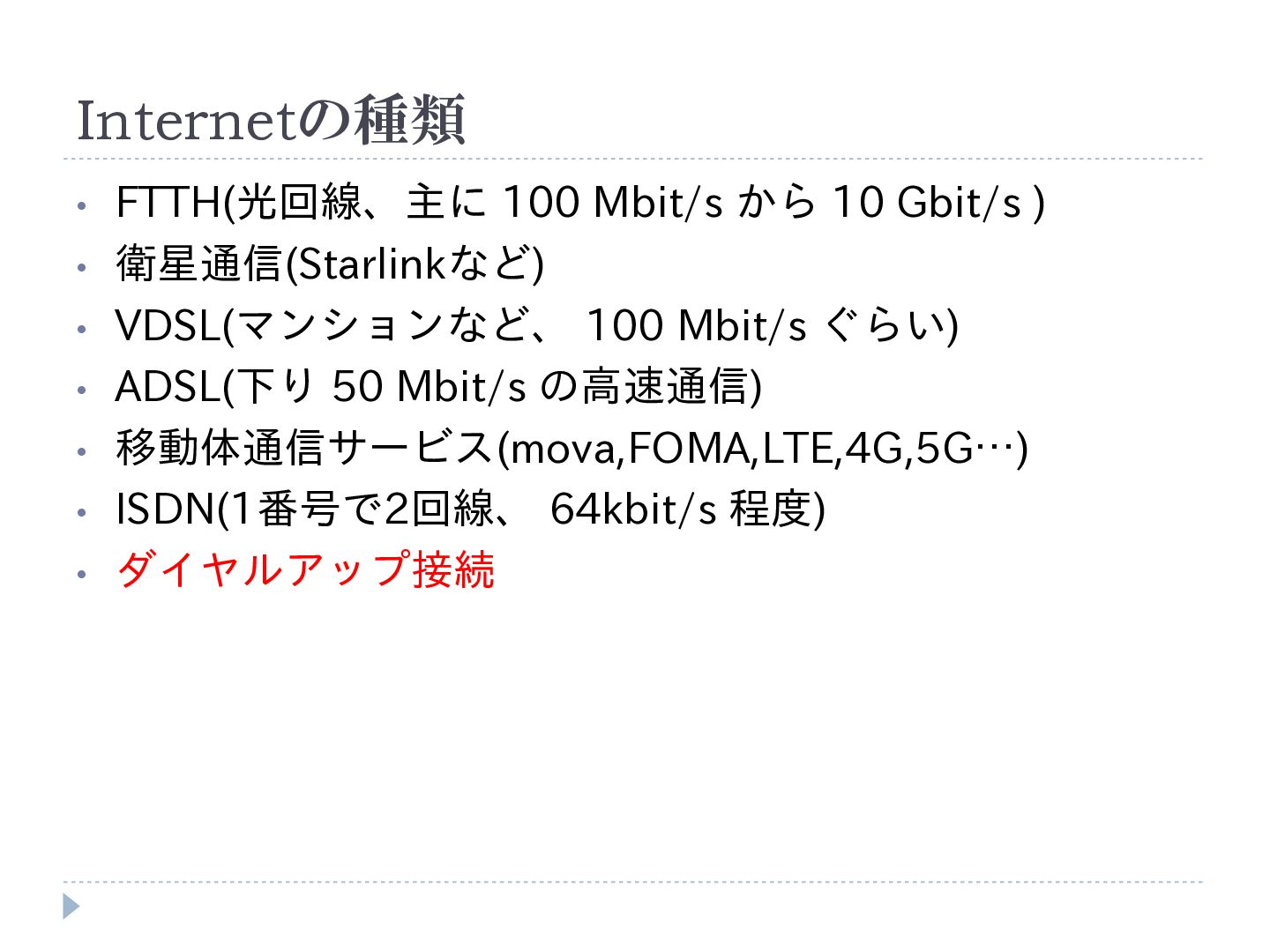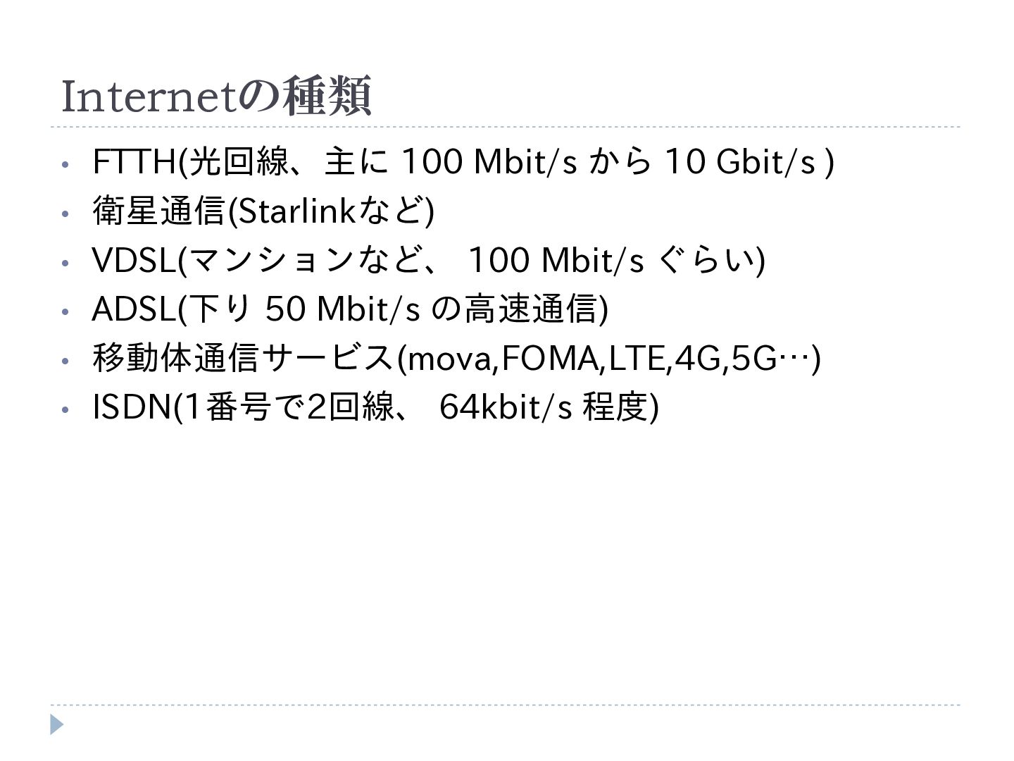 Internetの種類 • FTTH(光回線、主に 100 Mbit/s から 10 Gbit/s ) •