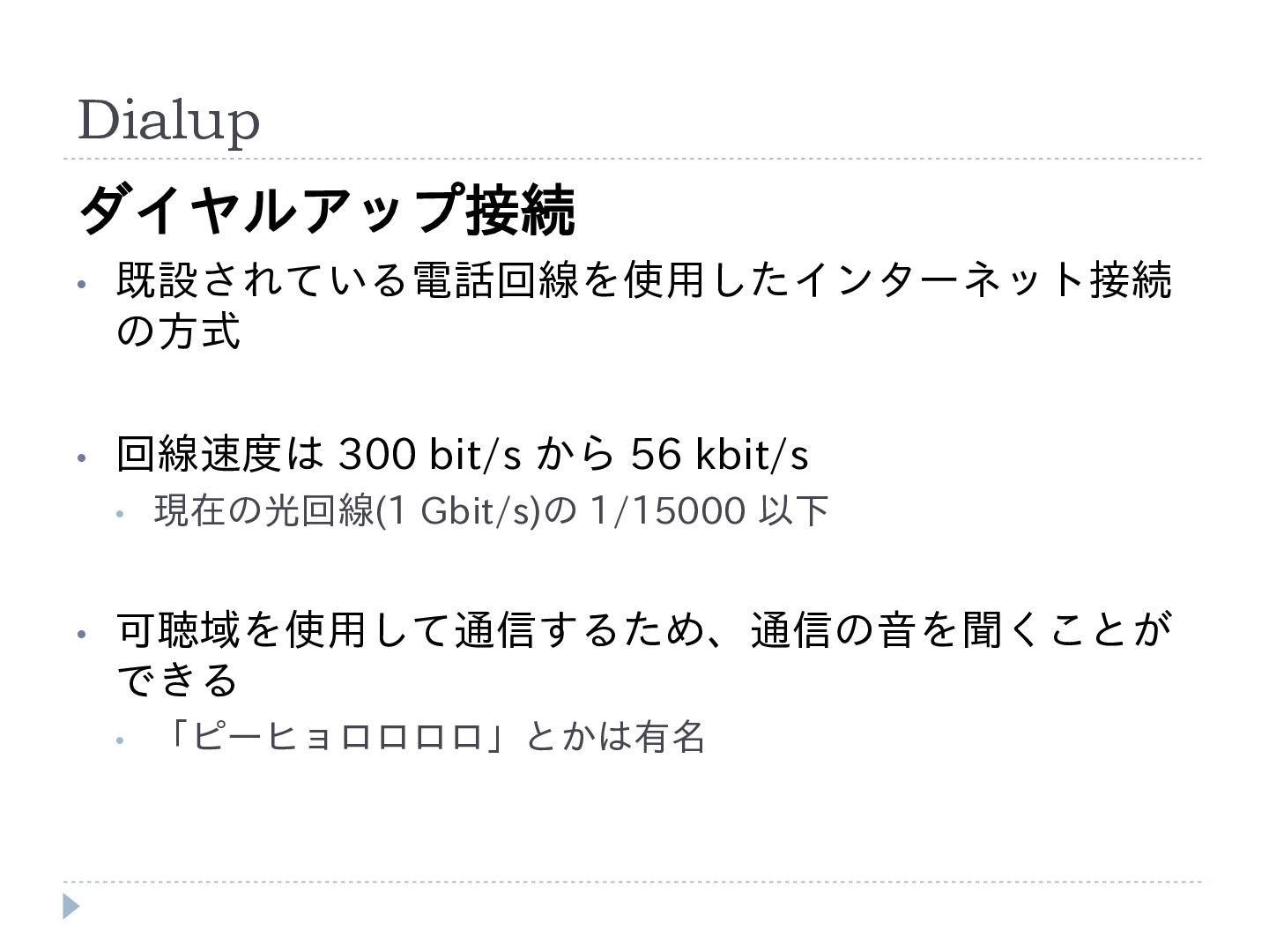 Dialup ダイヤルアップ接続 • 既設されている電話回線を使用したインターネット接続 の方式 • 回線速度は 300 bit/s から