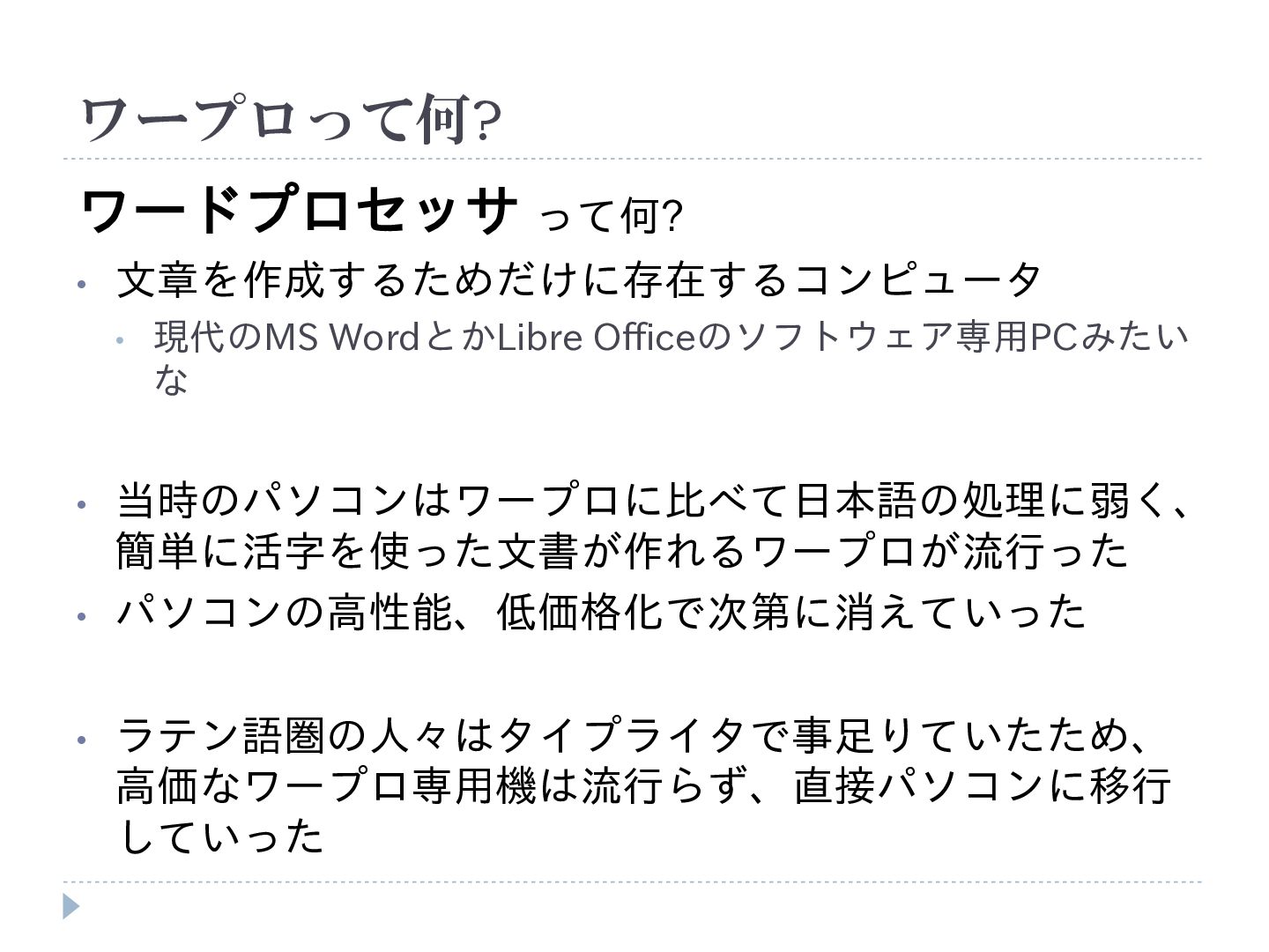 • 当時のパソコンはワープロに比べて日本語の処理に弱く、 簡単に活字を使った文書が作れるワープロが流行った • パソコンの高性能、低価格化で次第に消えていった • ラテン語圏の人々はタイプライタで事足りていたため、 高価なワープロ専用機は流行らず、直接パソコンに移行 していった