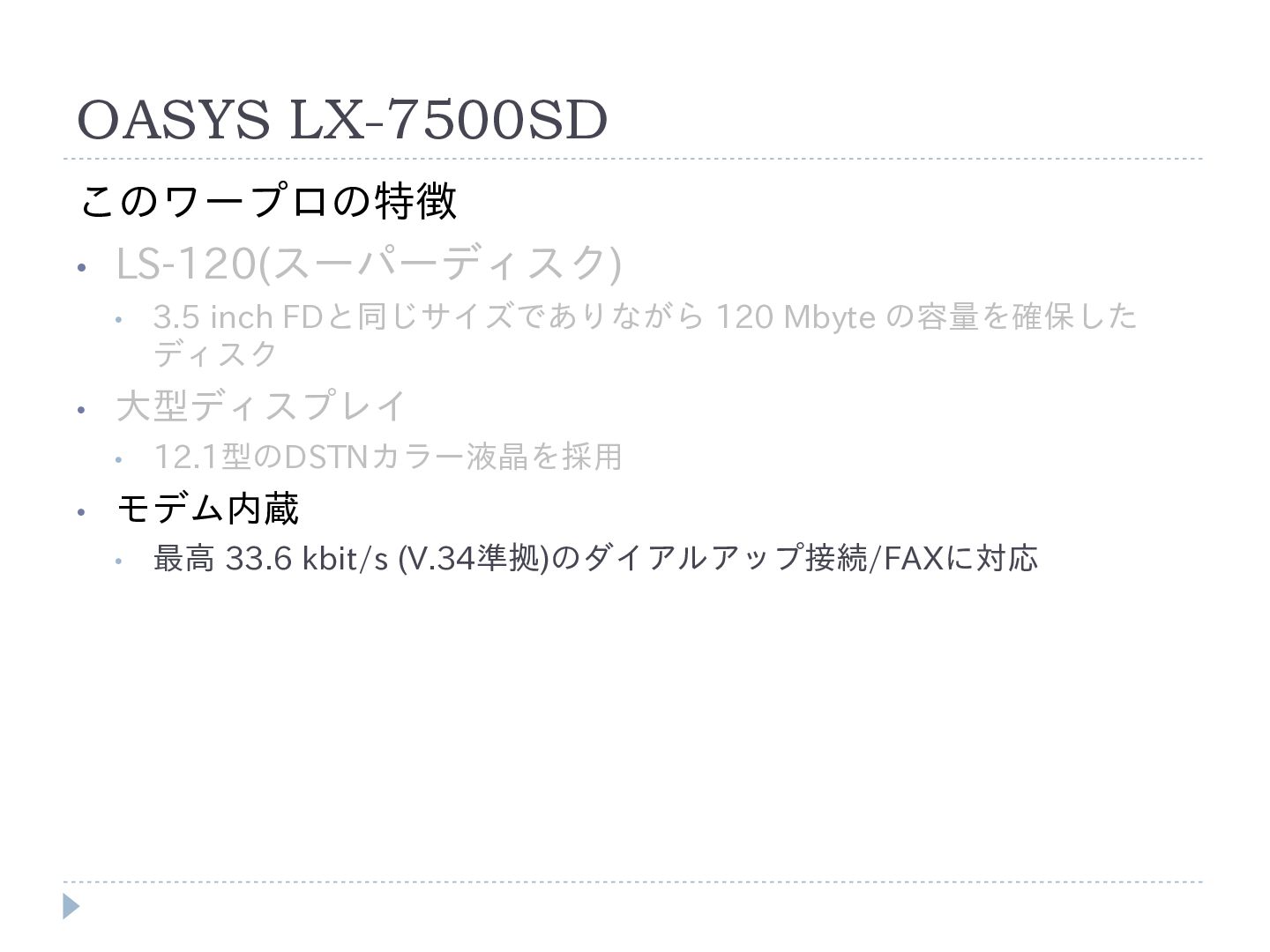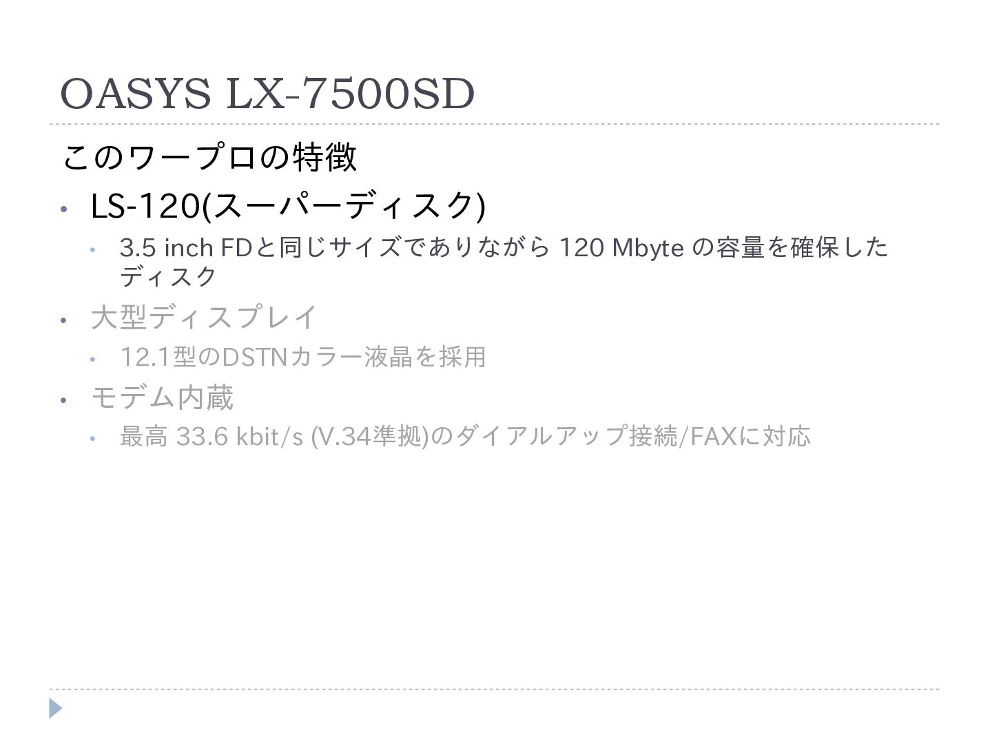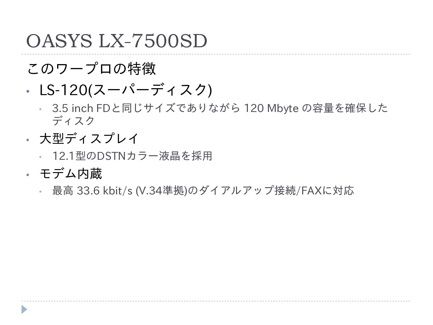 OASYS LX-7500SD このワープロの特徴 • LS-120(スーパーディスク) • 3.5 inch FDと同じサイズでありながら 120
