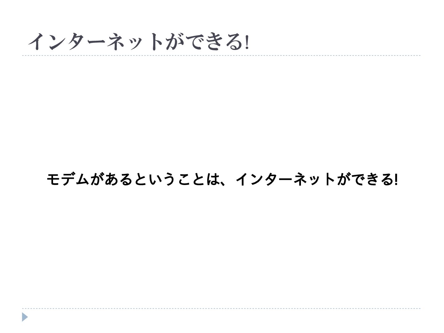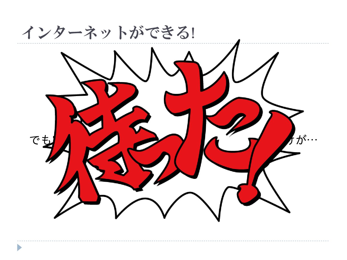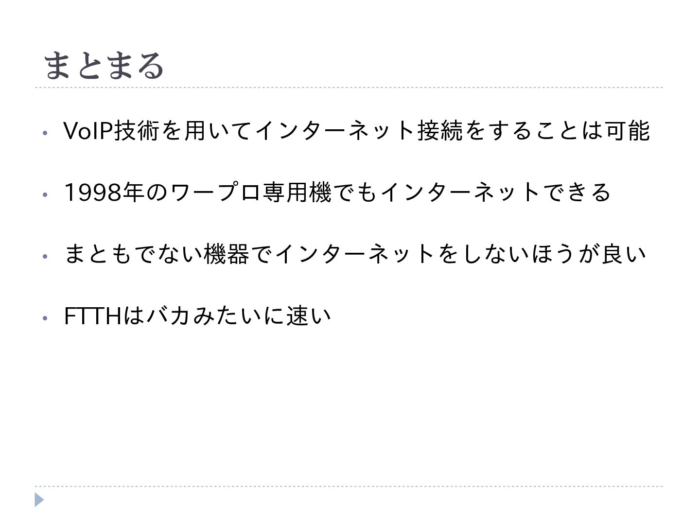 まとまる • VoIP技術を用いてインターネット接続をすることは可能 • 1998年のワープロ専用機でもインターネットできる • まともでない機器でインターネットをしないほうが良い • FTTHはバカみたいに速い